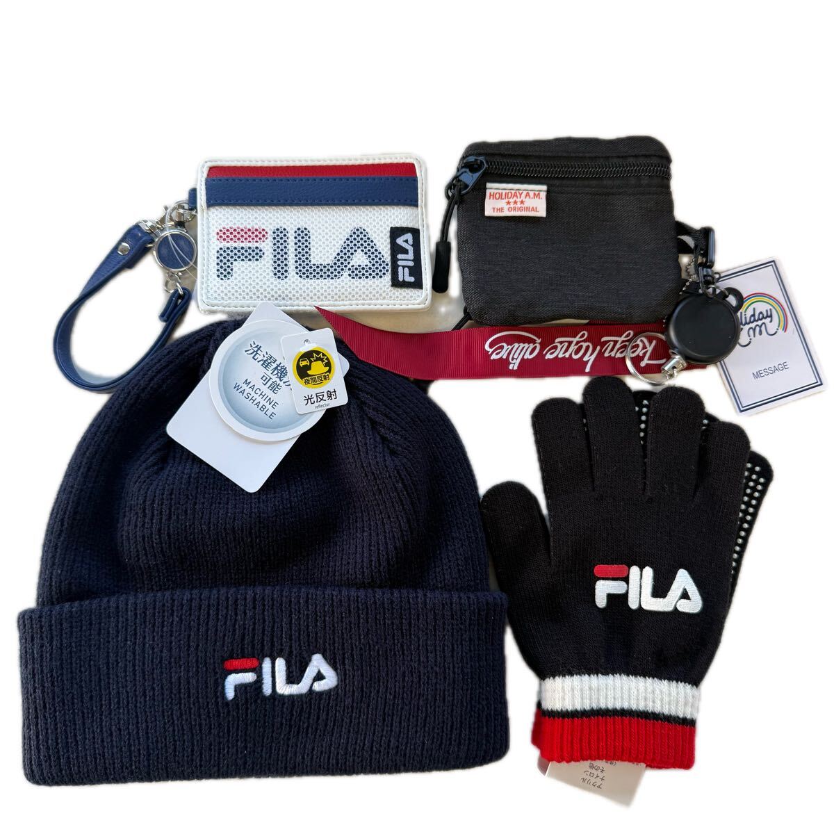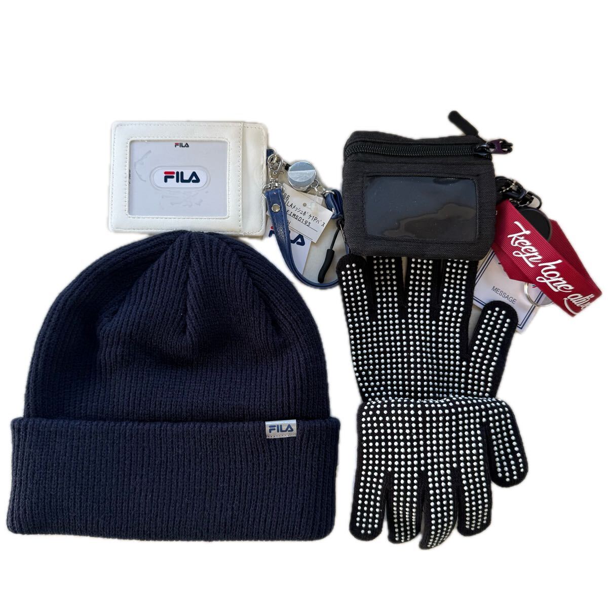 ニット帽とパスケースは黒色、手袋はグレーの色違いもございます。