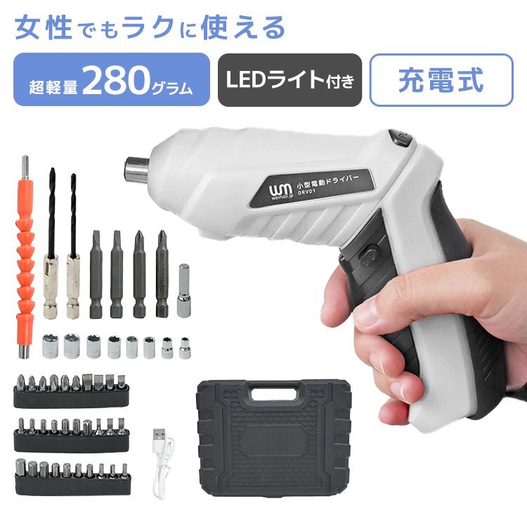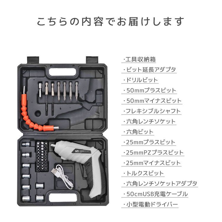 \カンタン&らくらく!どこでも使えるコードレス/ コードレスで手軽に使える充電式電動ドライバーです。 軽量&コンパクトだがら、長時間の作業でも疲れにくく、女性の方でもラクに使えます! 内蔵バッテリーを充電して使うコードレスタイプのため 電源のない屋外や車内、天井等どこでも作業可能です。 LEDライト付き!暗所でも手元を照らして安全に作業ができます。 便利なフレキシブルシャフトで様々なシーンに対応します。 ネジの回転の向きは、左右のボタンを押すだけで簡単切替可能! ビット交換時は、差し込むだけ&引っ張るだけの簡単着脱! 手軽に簡単に扱えるので初めての電動ドライバーや女性の方にもおすすめです! 【商品仕様】 商品内容: ・小型電動ドライバー ・工具収納箱 ・ビット延長アダプタ ・ドリルビット ・50mmプラスビット ・50mmマイナスビット ・フレキシブルシャフト ・六角レンチソケット ・六角ビット ・25mmプラスビット ・25mmPZプラスビット ・25mmマイナスビット ・トルクスビット ・六角レンチソケットアダプタ ・50cmUSB充電ケーブル サイズ: くの字スタイル:(約)14.5×13cm ストレートスタイル:(約)21.5cm 収納ケース:(約)23.5×18.5×奥行6.5cm 回転数:250回転/分 充電時間:3-5時間 可動時間:60-70分 本体重量:280g 材質:プラスチックABS、鉄 【注意事項】 ・商品は、モニターによって色合いが異なって見える場合があります。 ・仕様・デザインは改良のため予告なく変更することがあります。 |
