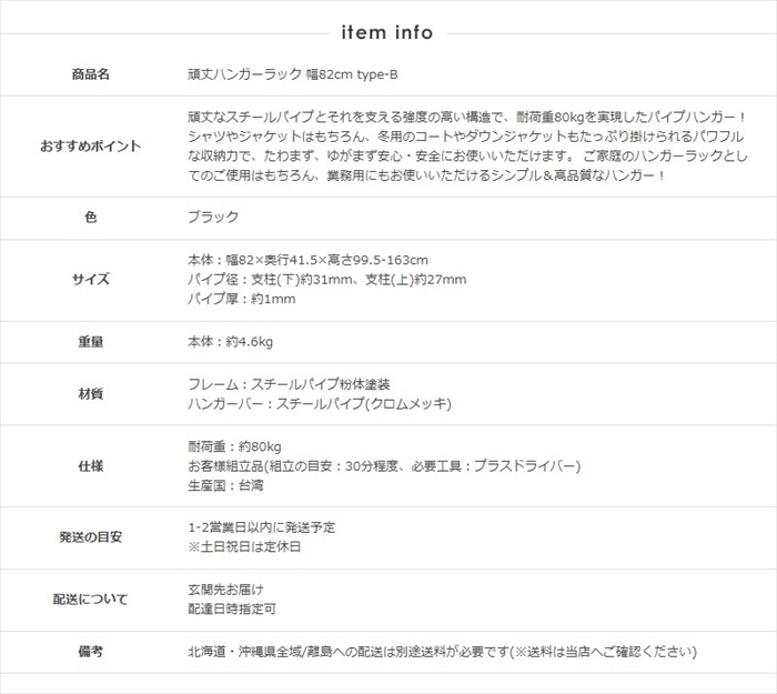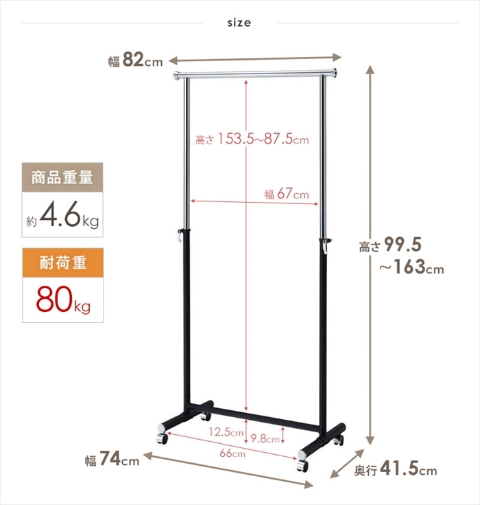 | 本体:幅82×奥行41.5×高さ99.5-163cm パイプ径:支柱(下)31mm、支柱(上)27mm パイプ厚:1mm |