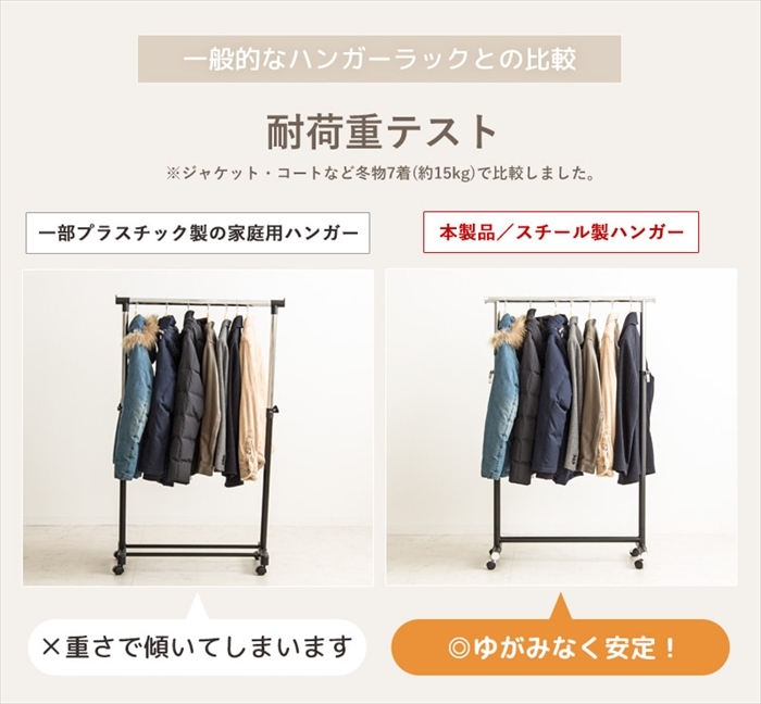 | フレーム:スチールパイプ粉体塗装 ハンガーバー:スチールパイプ(クロムメッキ) |