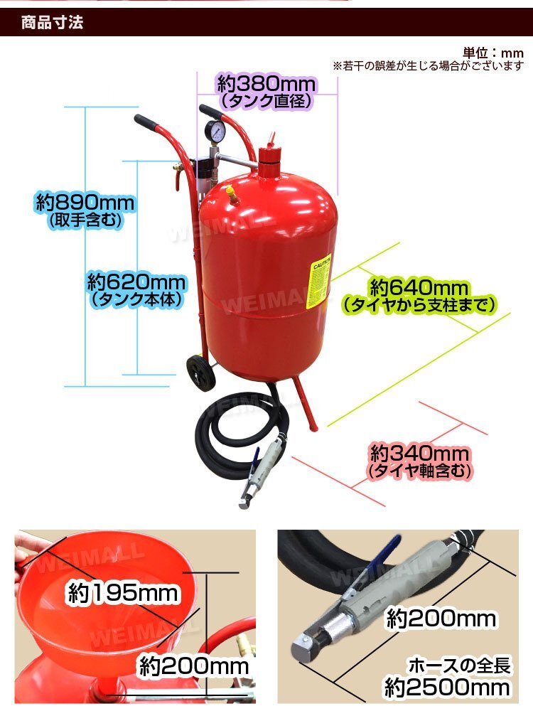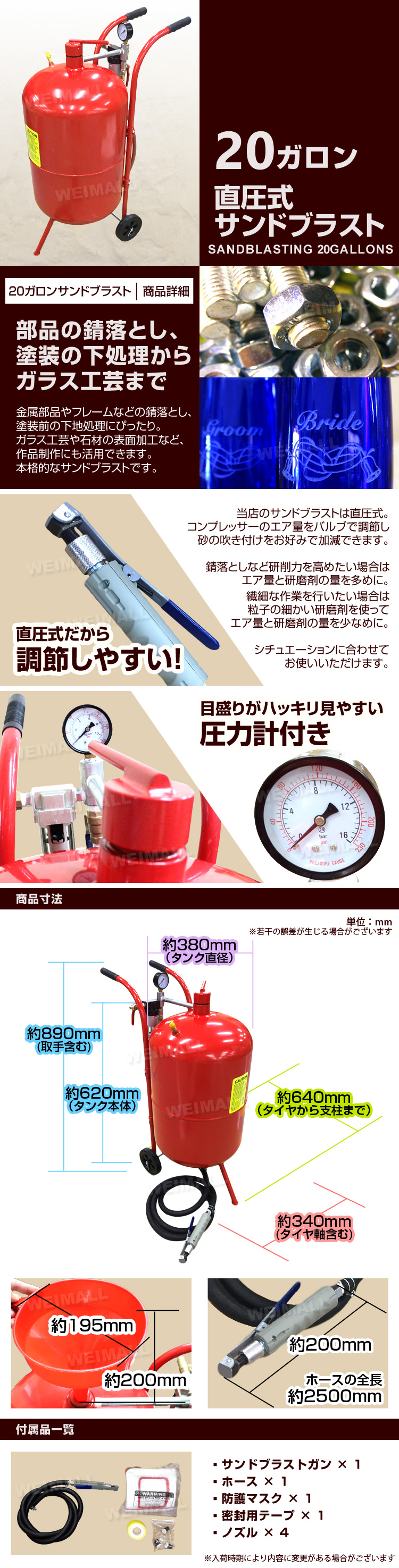 タンク内にブラストサンドを入れ、エアーの力で押し出し、サビや塗装を落とします。 ガラス工芸の研磨・彫刻等でご使用できます。 強力な噴射力!! 噴射のON/OFFはグリップ部分のレバーを握るだけの簡単操作!! うれしい防護マスク付きです。 【商品詳細】 ・タンク容量:20ガロン ・本体サイズ:880×460×420mm ・使用空気圧:60~125psi ・重量:21kg 【商品内容】 ・サンドブラストガン ×1 ・ノズル ・ホース:2.5m ×1 ・防護マスク ×1 ※写真と実物は多少異なる場合がございます。あらかじめご了承下さい。 |