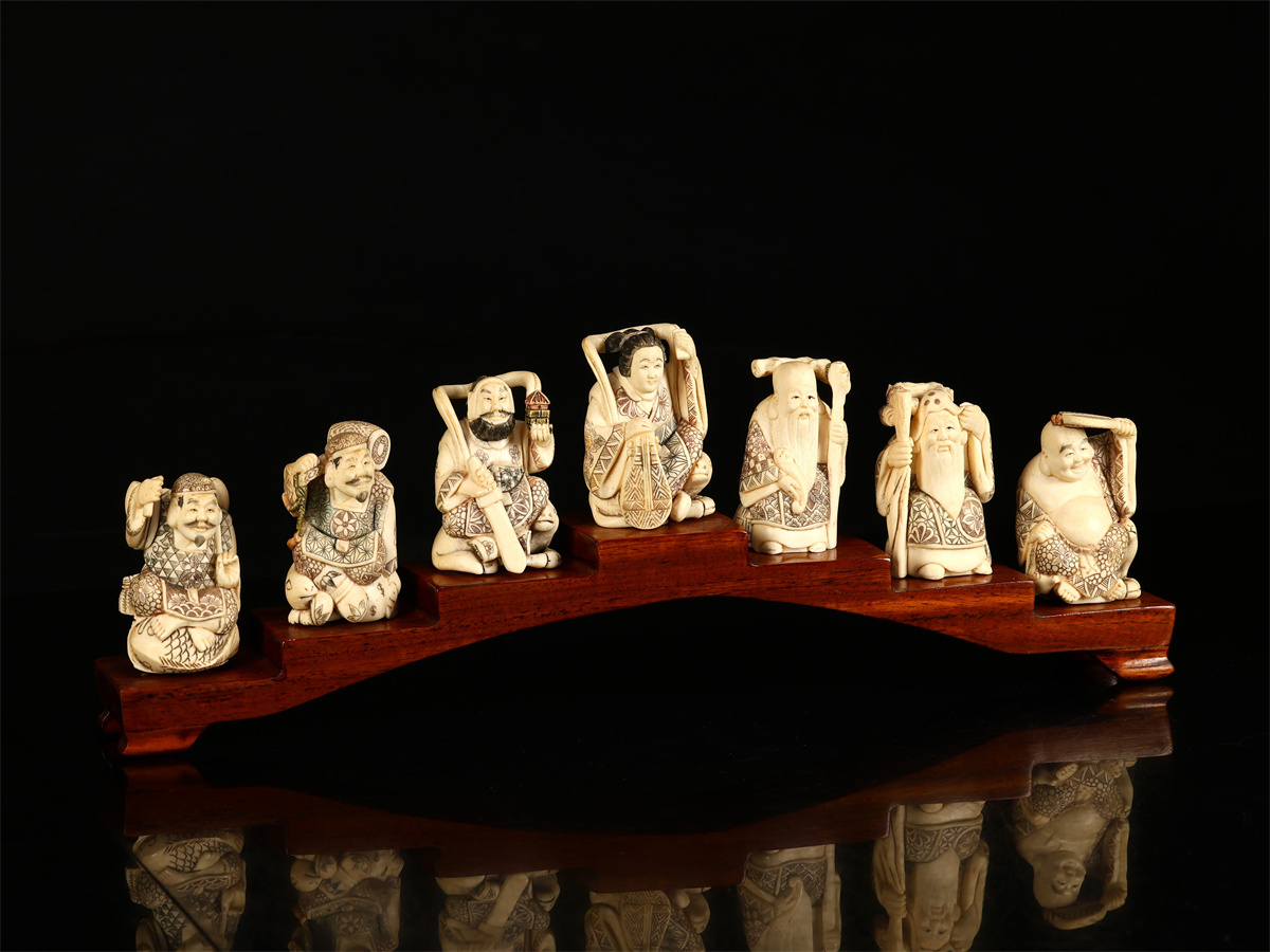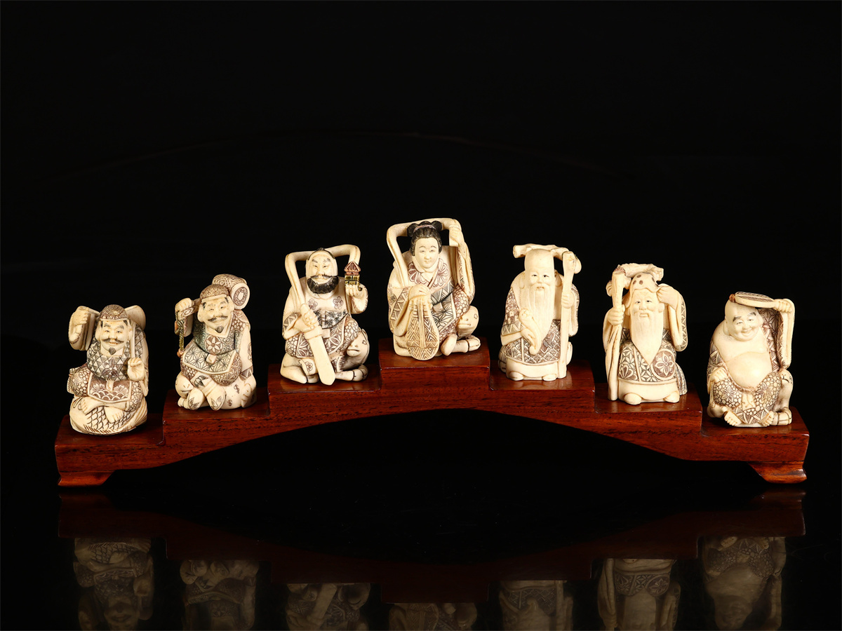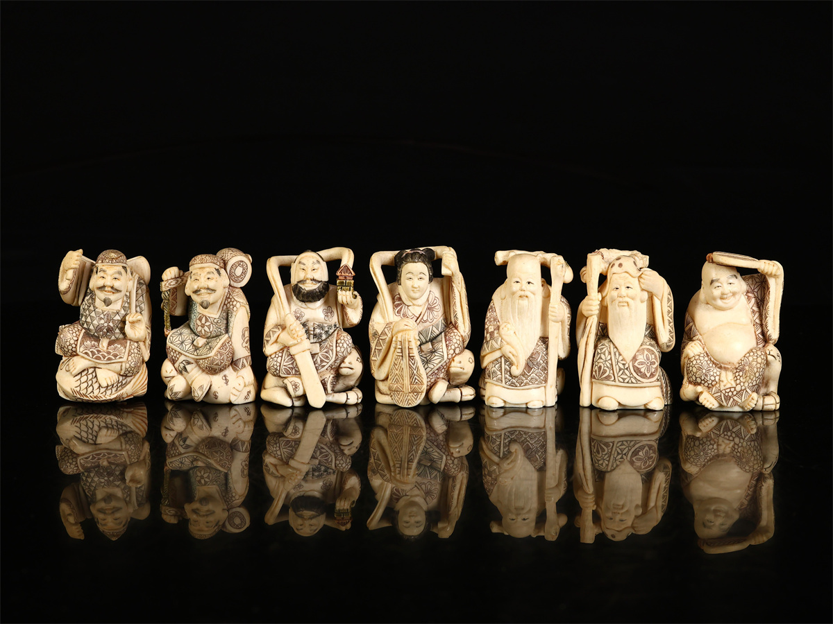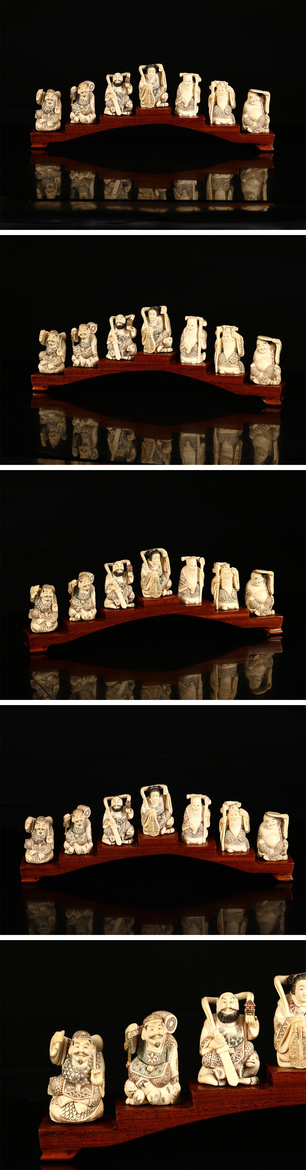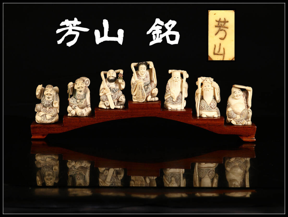 久1418 時代 【芳山 銘】 東洋彫刻 七福神 置物 7点 重498g 美品Y