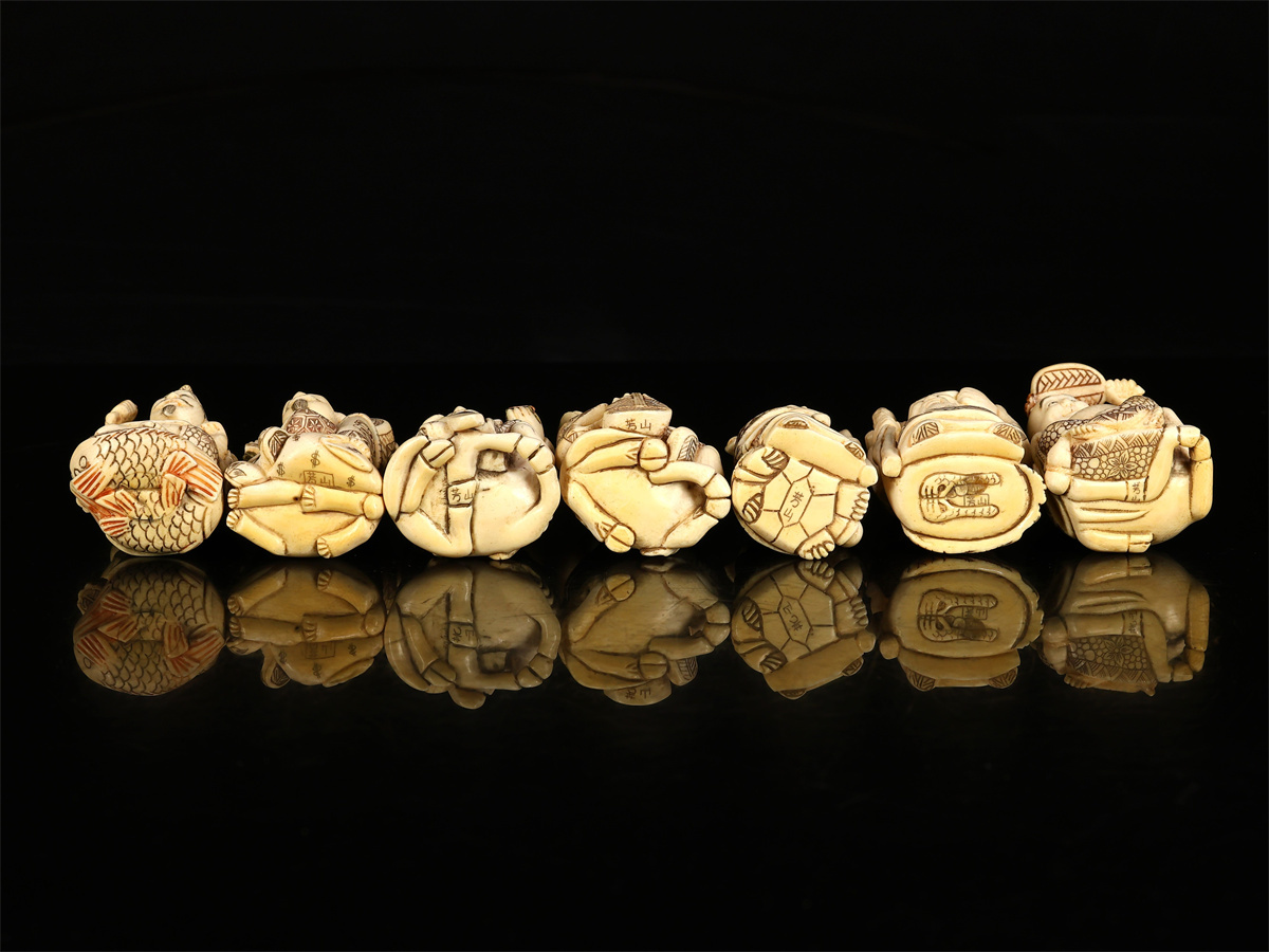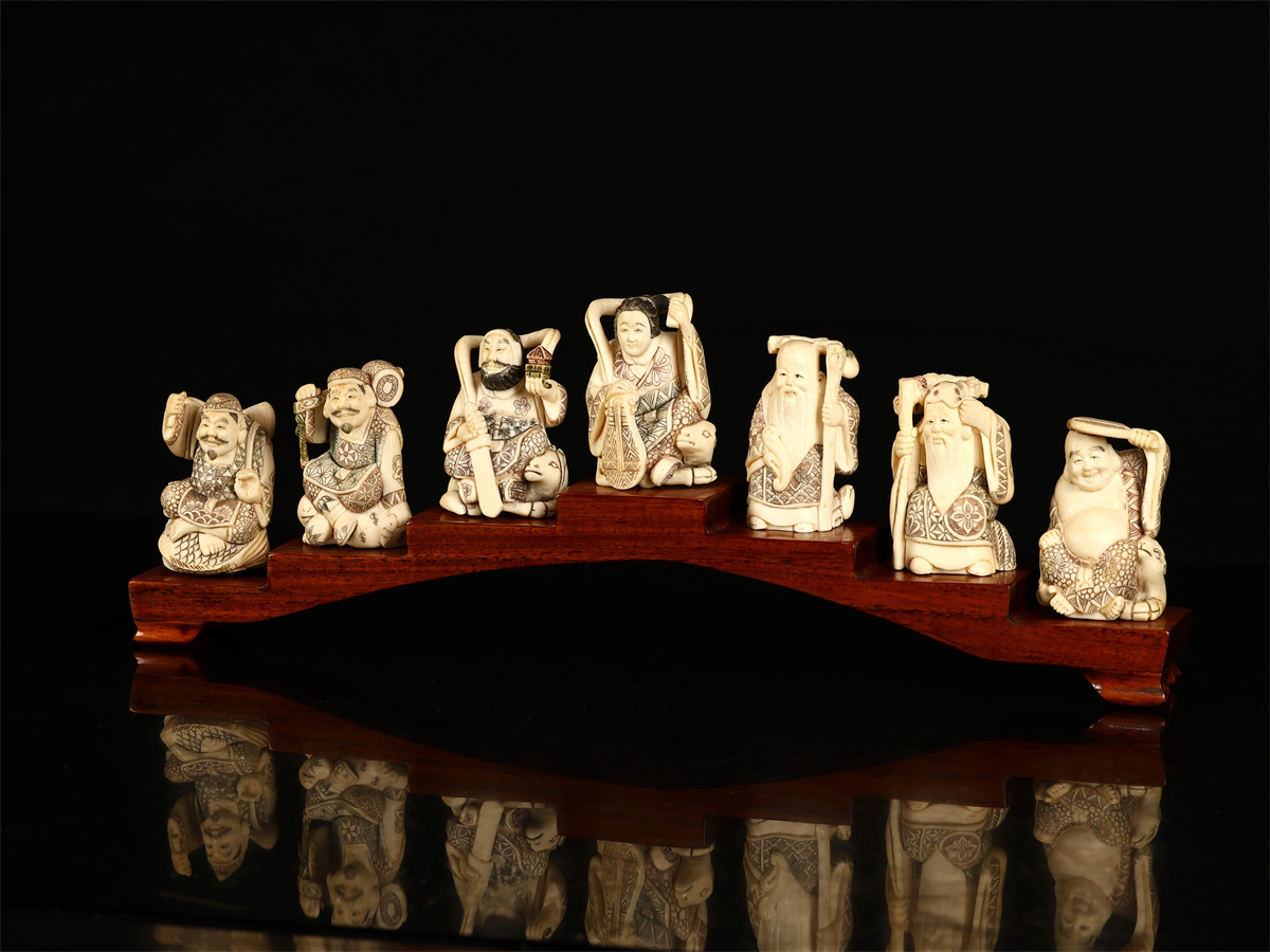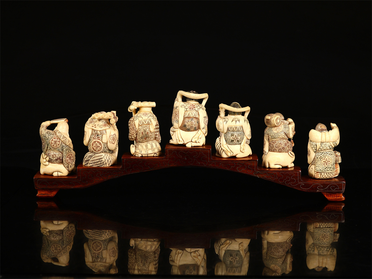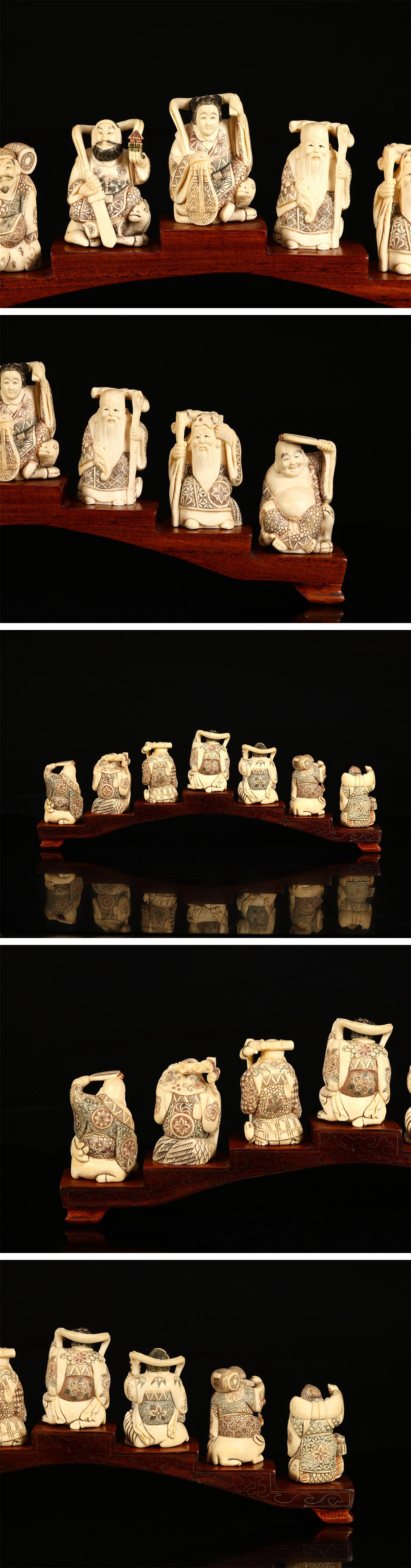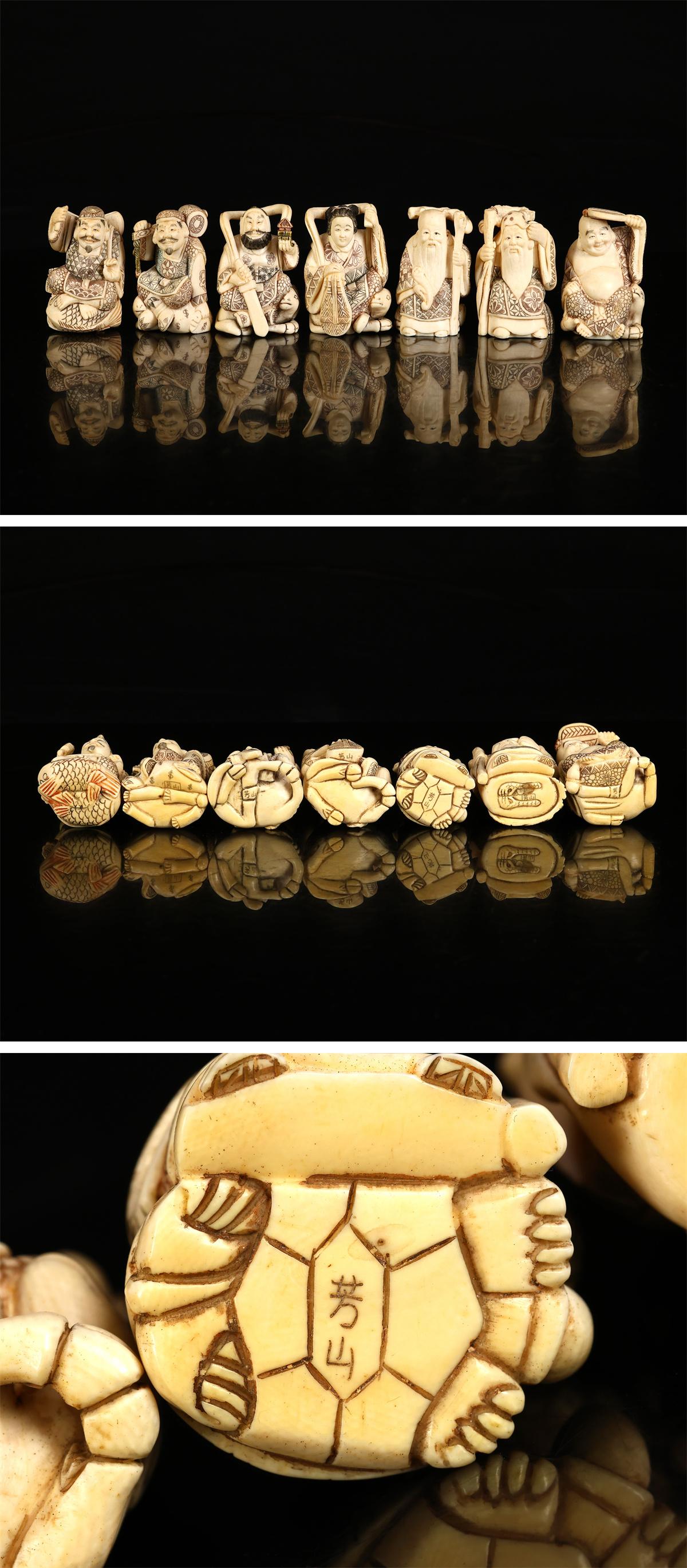 久1418 時代 【芳山 銘】 東洋彫刻 七福神 置物 7点 重498g 美品Y