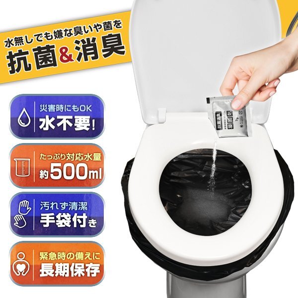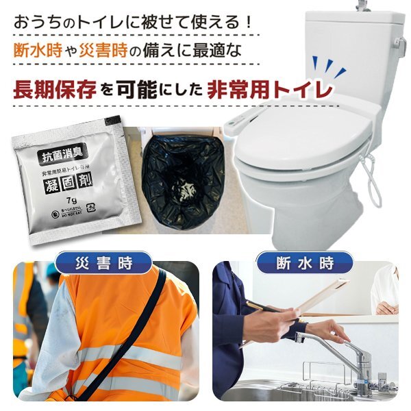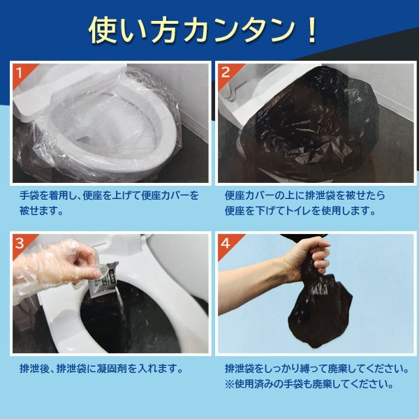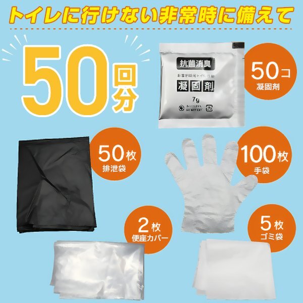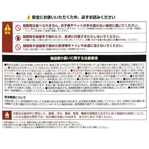 | セット内容 | 凝固剤×50 排泄袋(黒)×50 手袋×100 便座カバー(透明)×2 ゴミ袋(白)×5 |