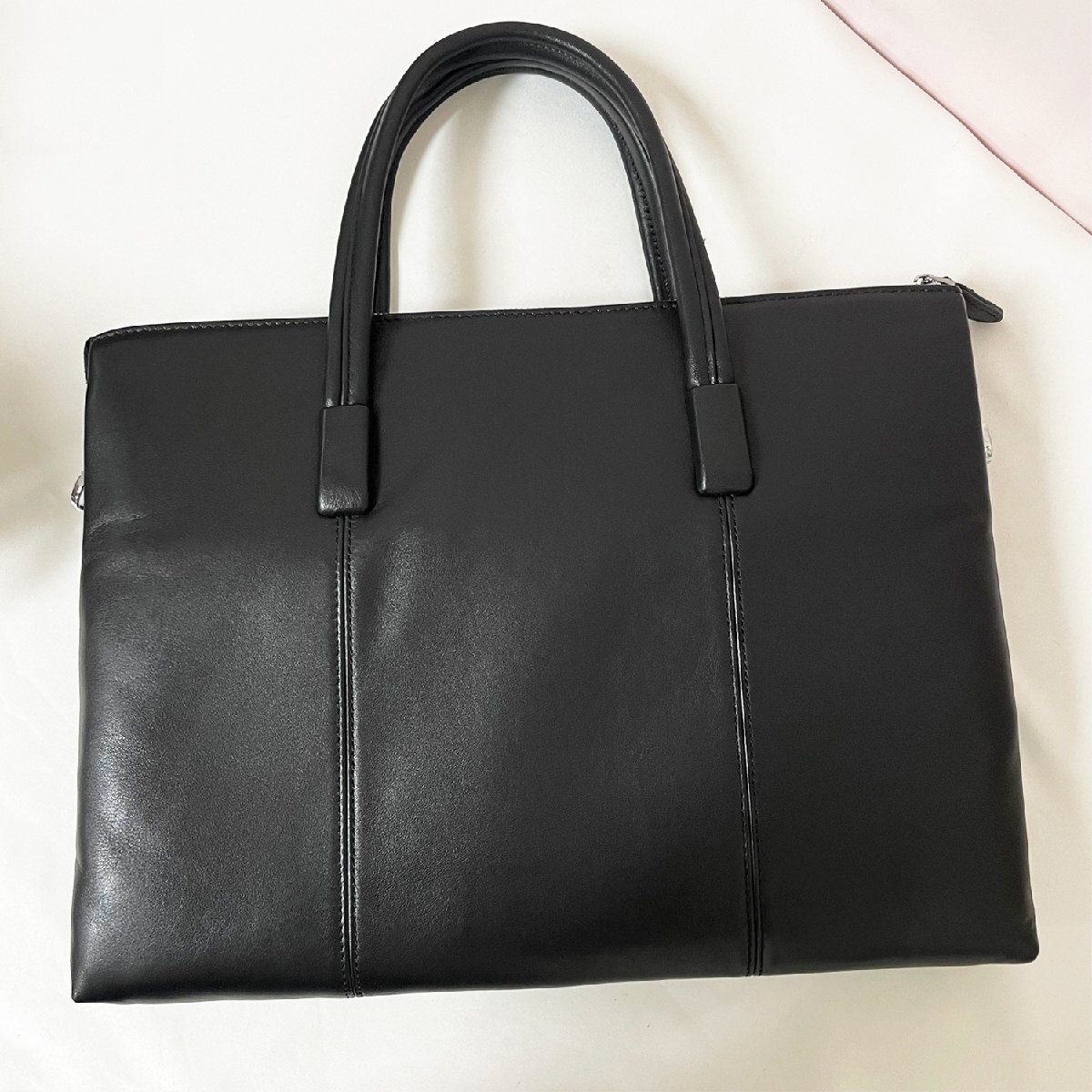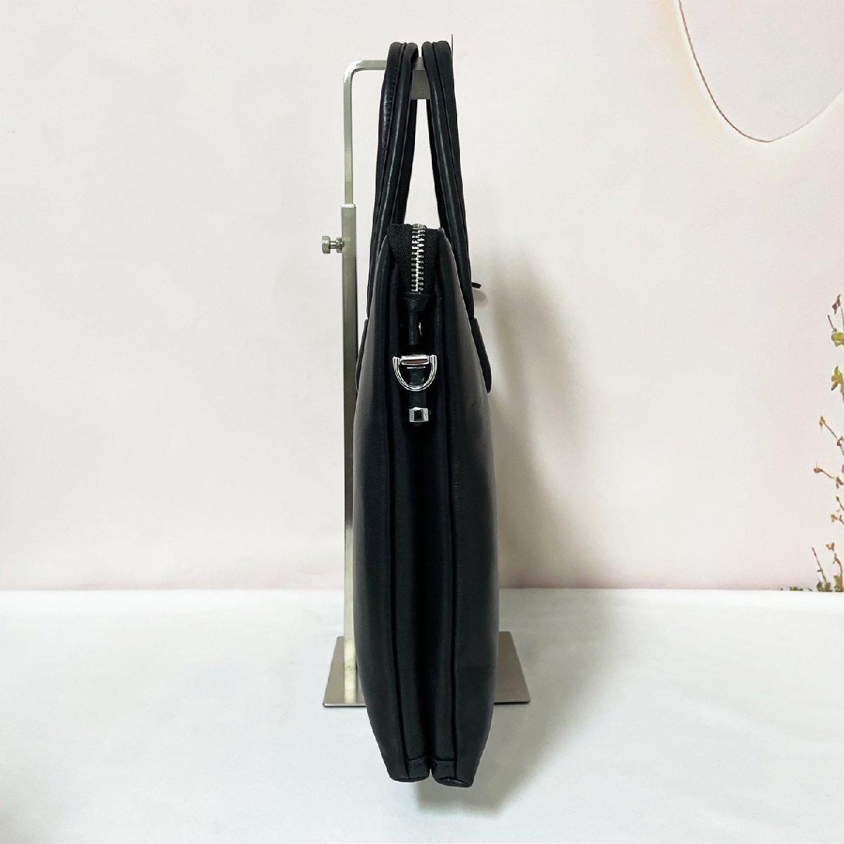 強さや高級感を感じさせるブラックは、ビジネスシーンでは定番カラー。ハンドル部分にも牛革を贅沢に使用して、長持ちできるように素材にこだわりました。バッグの開閉口は、シルバーファスナーを採用、定番ながら錆びにくく、耐久性も期待できます。内側には収納スペースが3層になっていて、ノートパソコン、財布、手帳やスマホなど、ビジネスマンが必要最低限の物を収納するのにベスト。また、付属のショルダーベルトで、ショルダースタイルになり、両手が楽々。自転車に乗るとに、他の荷物がある時に重宝します。