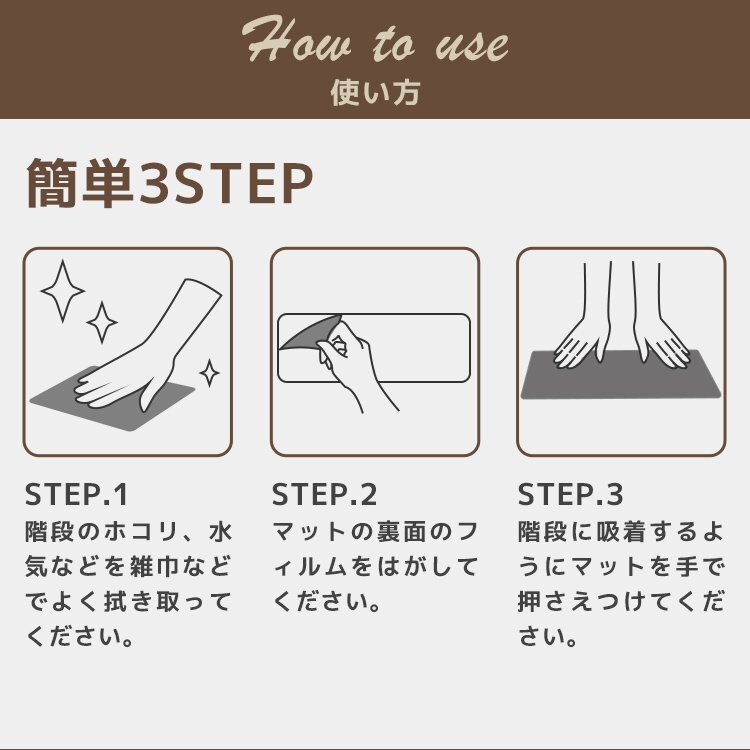\ ズレない・防音・キズ防止の3拍子階段マット / ズレにくい吸着タイプ!! 裏面には滑り止め加工を施しておりズレにくく お子様、お年寄り、ペットの転倒を防止します! 吸着性特殊ゴム採用!!! 裏面は吸着性の高い特殊ゴム(アクリル樹脂)を使用しているため しっかりと吸着しまた、ゴム素材なので剥がした痕が残ることも ベタつくことはありません つらい冬の寒さ対策に!! 冷たくて、つらい冬場の階段もこのマットを敷くだけで 快適に過ごせます!! 【商品コード】FCF45BR 【商品詳細】 カラー:ブラウン サイズ(約):横70cm×縦20cm×厚み0.3cm 素材:ポリエステル、TPR 【内容】 本体×15枚 【注意事項】 ・マットの吸着力が弱まったら使用せずお買い換えください。 ・長時間敷いたままにしておくと、剥がしにくくなりマットの剥がし痕が残る場合がございます。 週に1度は裏面を空気に触れさせてください。 ・吸着力が強くなっているときは、ゆっくりと剥がしてください。 ・スリッパなどの裏面が平らな履物での昇降は転倒する危険があります。 ・洗濯する場合は、ぬるま湯で手洗いまたは選択ネットに入れて洗濯機の弱水流で洗ってください。 ・商品は、モニターによって色合いが異なって見える場合があります。 ・仕様・デザインは改良のため予告なく変更することがあります。 【もちろん新品未使用品です】 |