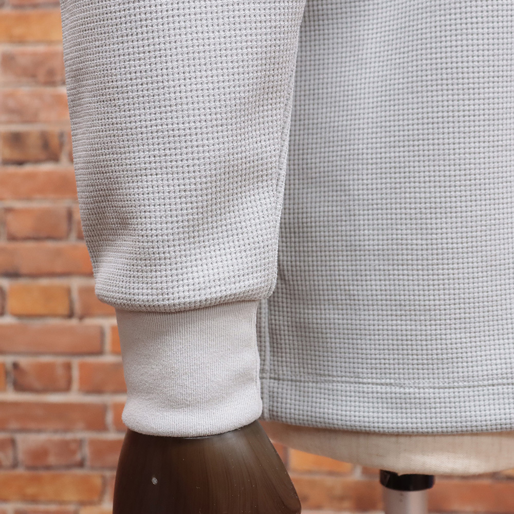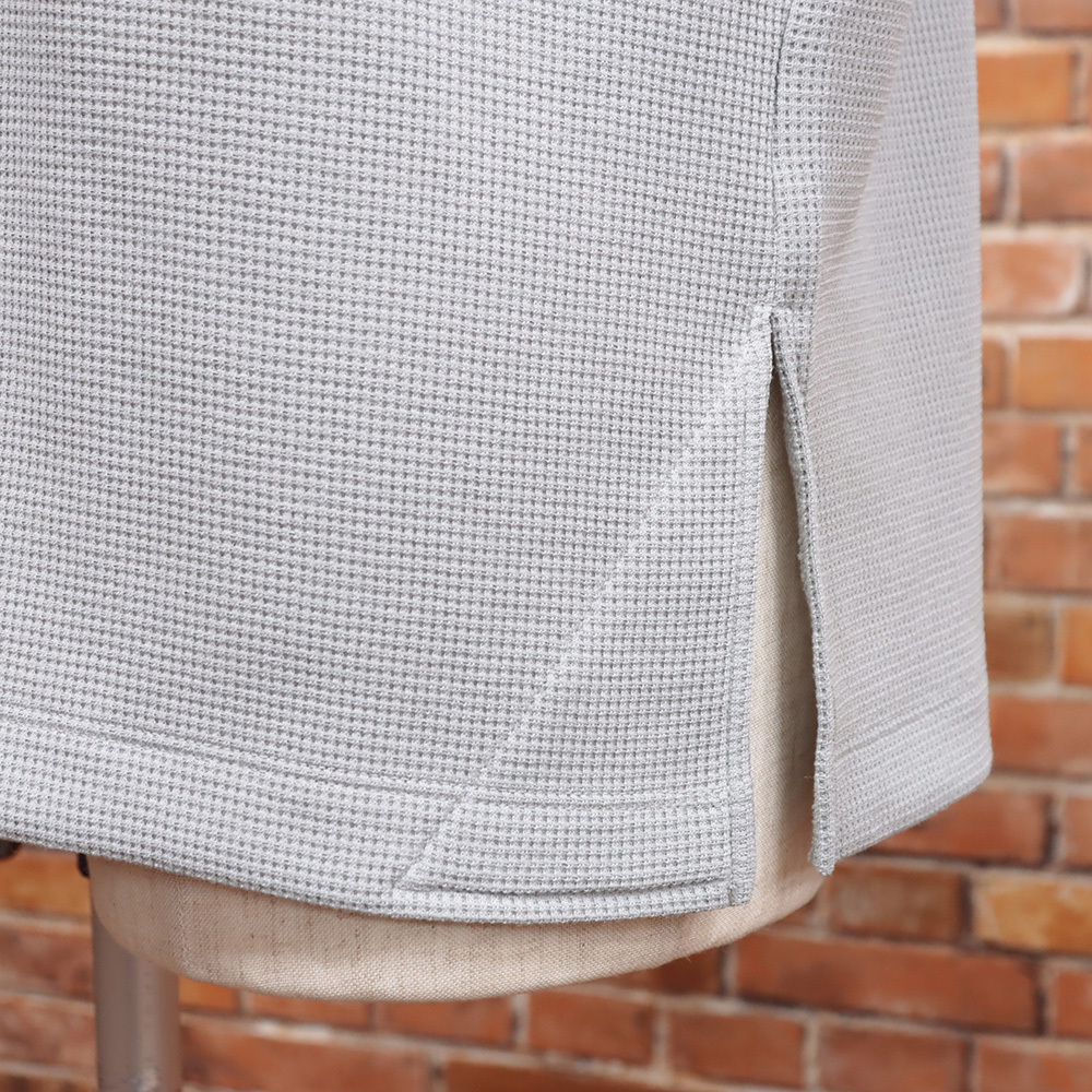 幅広いコーディネートに活躍してくれる、シンプルで使い勝手のよいロングスリーブTシャツ。サラサラとした清涼感のある肌触りが魅力のワッフル素材を使用しています。しなやかな風合いでストレッチも効いており、着心地はとても快適。イージーケアで着用後もシワにもなりにくく、伸びやダレも少なく、毛玉の発生も防ぎます。UVカット機能もあり、更に吸水速乾性にも優れた素材です。ゆったりめながら、だらしなく見えない絶妙なシルエットも好ポイント。ポケットの内側とスリットの裏側にEt baasロゴモノグラムのメガネ拭き生地をあしらい、メガネやスマートフォンの汚れをサッと落とせるユニークなデザインとなっています。