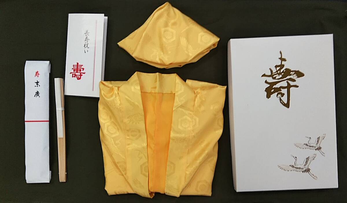 メーカー不明 米寿ちゃんちゃんこセット(長寿祝い) 黄色鶴・亀柄・亀甲柄・吉祥文様 Fサイズ 男女兼用