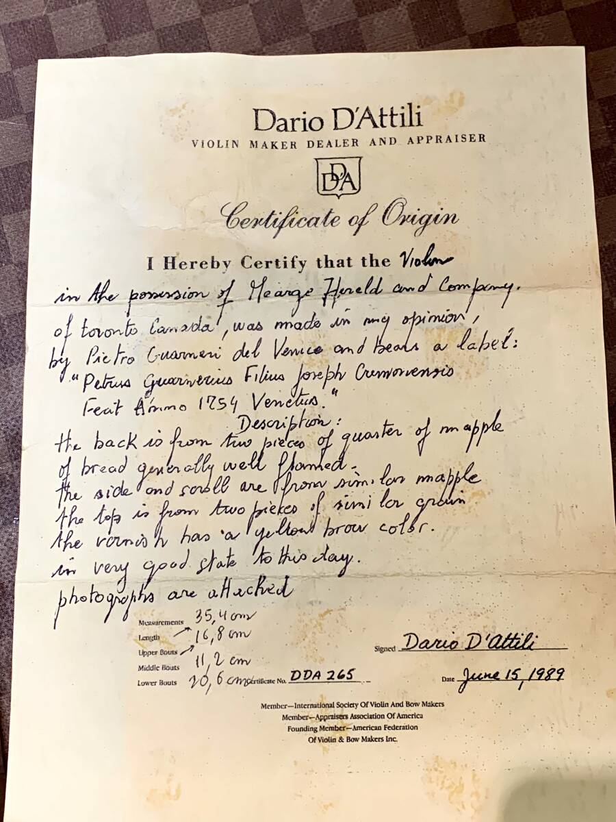 [認証証明書] Pietro Guarneri 'of Venice’ 1754 年イタリア製バイオリン4/4.