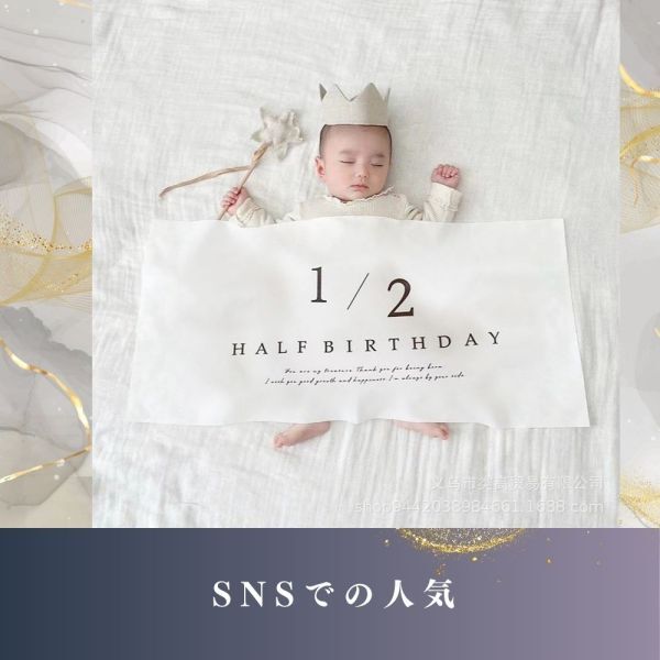 このタペストリーはSNSで大人気で、誕生から半年の記念に最適です。ベビーのおなかの上にかけたり、壁に貼って抱っこしながらの撮影にも使える素敵なアイテムです。壁面用の固定金具が付属しており、新品未使用の状態でお届けします。実物の写真も掲載しているので、ご確認いただけます。
