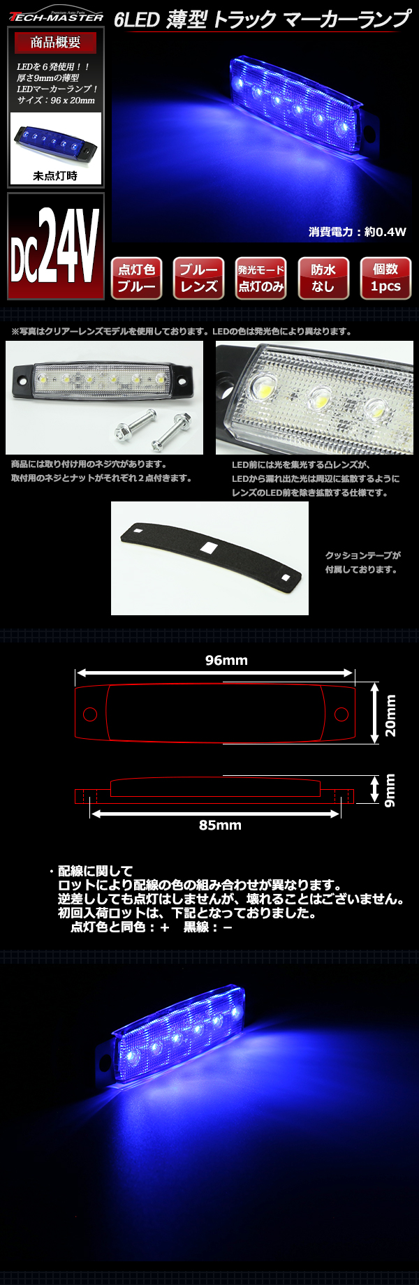 ■商品コード FZ266 ■商品タイトル 24V用 6LED 薄型 トラック マーカーランプ ■対応電圧 DC24V専用 ■レンズカラー ブルー ■発光色 ブルー ■数量 1個 出品数以上ご必要な方は、必ず落札前に 質問欄よりご質問ください。 ※在庫があれば対応は可能ですが、 ヤフオクの規約上、ご落札いただいた商品と その個数しかお取引ができませんので別途出品します。 そちらよりご落札ください。 お急ぎの方はリンク先の弊社ヤフーショッピング店でも 同じ商品を出品しております。 ■特徴 DC24V専用のトラック用のマーカーランプ! コストパフォーマンス重視のマーカーランプとなり これまでマーカーをつけたことがない方にはお勧めです。 コストパファーマンス重視となっているため、 弊社で販売中の他のマーカーランプより やや明るさは劣ります。 ■注意事項 防水処理はされておりません。必ず防水処理を 行ってください。 ご落札後のレンズカラーや発光色の変更は行えません。 商品説明文やタイトルに記載しているレンズカラーと 発光色をお間違えがないようにお願いします。 |