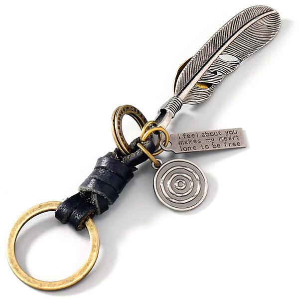 ★ ヴィンテージ風 フェザー キーホルダー★ターコイズ レザー アンティーク調 メンズ キーリング アメカジ ネイティブ インディアン風 ★