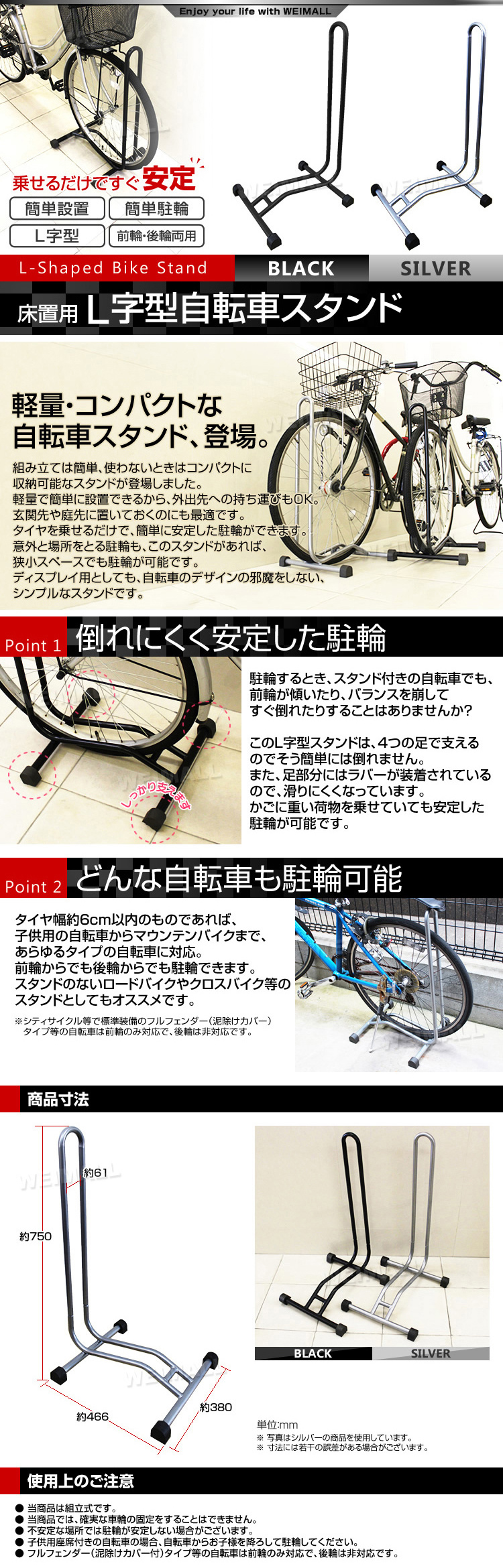 L字型自転車スタンドです。 20インチの子供用の自転車からマウンテンバイクなどのタイヤの太い車種、 ロードバイクなどタイヤの細い車種まで幅広く対応!! とても軽量・簡単設置可能なので、店舗の駐輪スペース、庭先や玄関先などでも最適♪ スタンド使わない時は分解して収納可能です。 ■ 商品仕様 サイズ(約):高さ750×幅380×奥行466mm 重量(約):1.7kg 適応サイズ:20〜29インチ 材質:スチール ※写真と実物は多少異なる場合がございます。あらかじめご了承下さい。 |