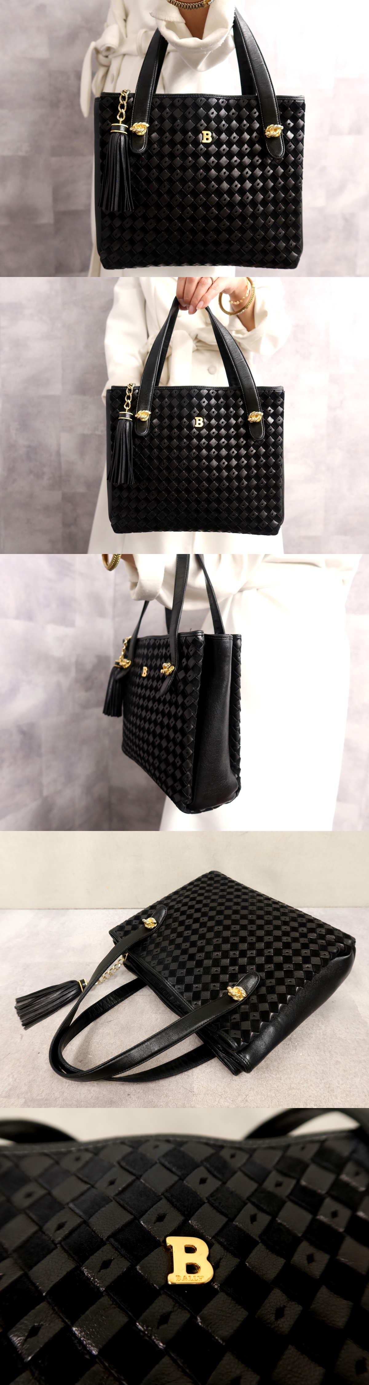 ●超美品●BALLY バリー●Bロゴ●編み込み●タッセル●スエード ラム レザー 本革●ハンド バッグ●黒●ゴールド金具●腕掛け●Js65180
