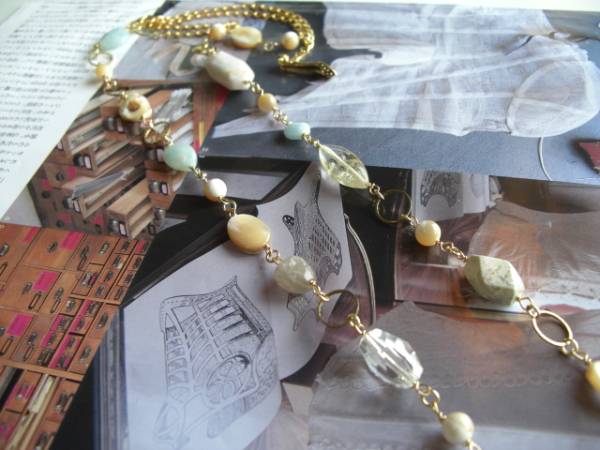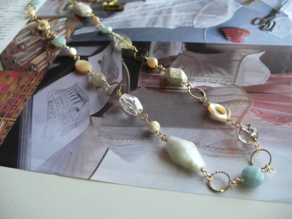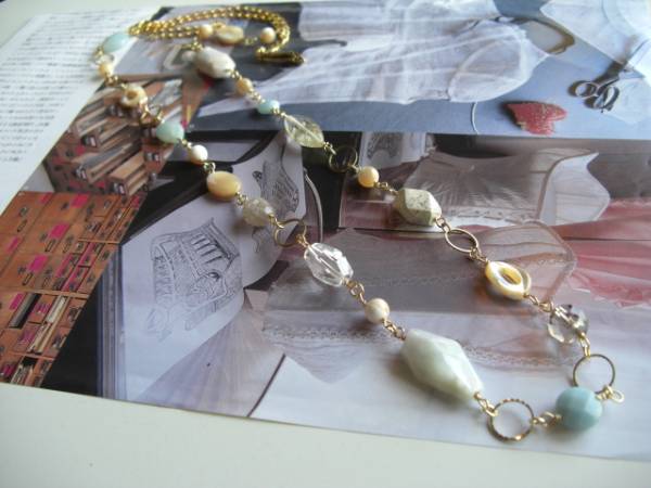 秋色・クローゼット・・シリーズです♪ロマンチック仕様・・シックなマザーオブパールのネックレスです♪丸玉やリング、オーバルなどデザイン違いのマザーオブパールに水晶やレモンクォーツ、シトリン、アマゾナイト、クリソプレーズなど宝石質の石を合わせてひっそりと華やかな表情です♪6ミリから14ミリ位までの丸玉、リング、オーバルのマザーオブパールに10ミリから30ミリ位までの水晶やルチルクォーツ、レモン水晶、シトリン、アマゾナイト、クリソプレーズなどのラウンドカットやラフカット、ナツメカットを合わせました♪長さは全長92センチ位で調節自由です♪2連にされても素敵です♪お揃いのネックレスやブレスレットも出品しています♪♪シンプルで飽きのこないいつまでも着けられるデザインを考えて作りました!ハンドメイドをご理解頂いてノークレーム、ノーリターンでお願いします
