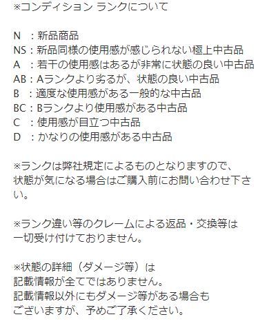 ●商品は全て正規品本物のみの取り扱いになります。 入札後のキャンセル、返品、交換・質問等は承る事が出来ません。 ●落札後のメールによるご案内、お問合せに対するご返事は、 営業時間内とさせて頂きます。ご了承下さいませ。 ●当店では実店舗でも並行販売いたしております。在庫状況の確認・反映には注意をはらっておりますが、 タイムラグによりご注文頂いた商品が品切れとなっている場合もございます。 その際は何卒ご理解頂きますようお願い申し上げます。 ●商品落札日から3日間を経過しても、入金確認が出来ない場合はお取引を 「お客様都合によるキャンセル」とさせていただく場合がございます。 |