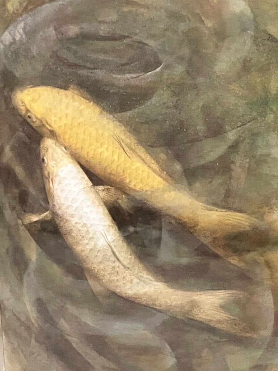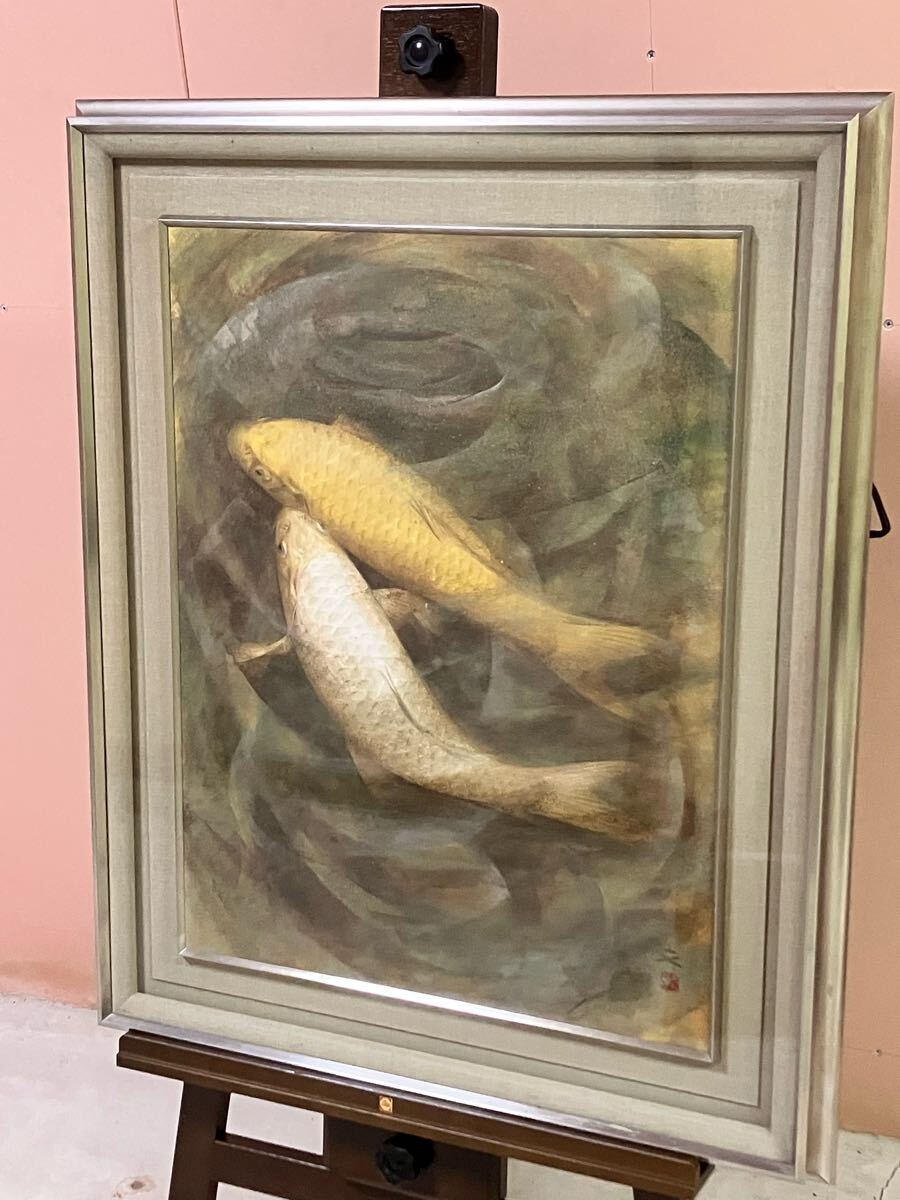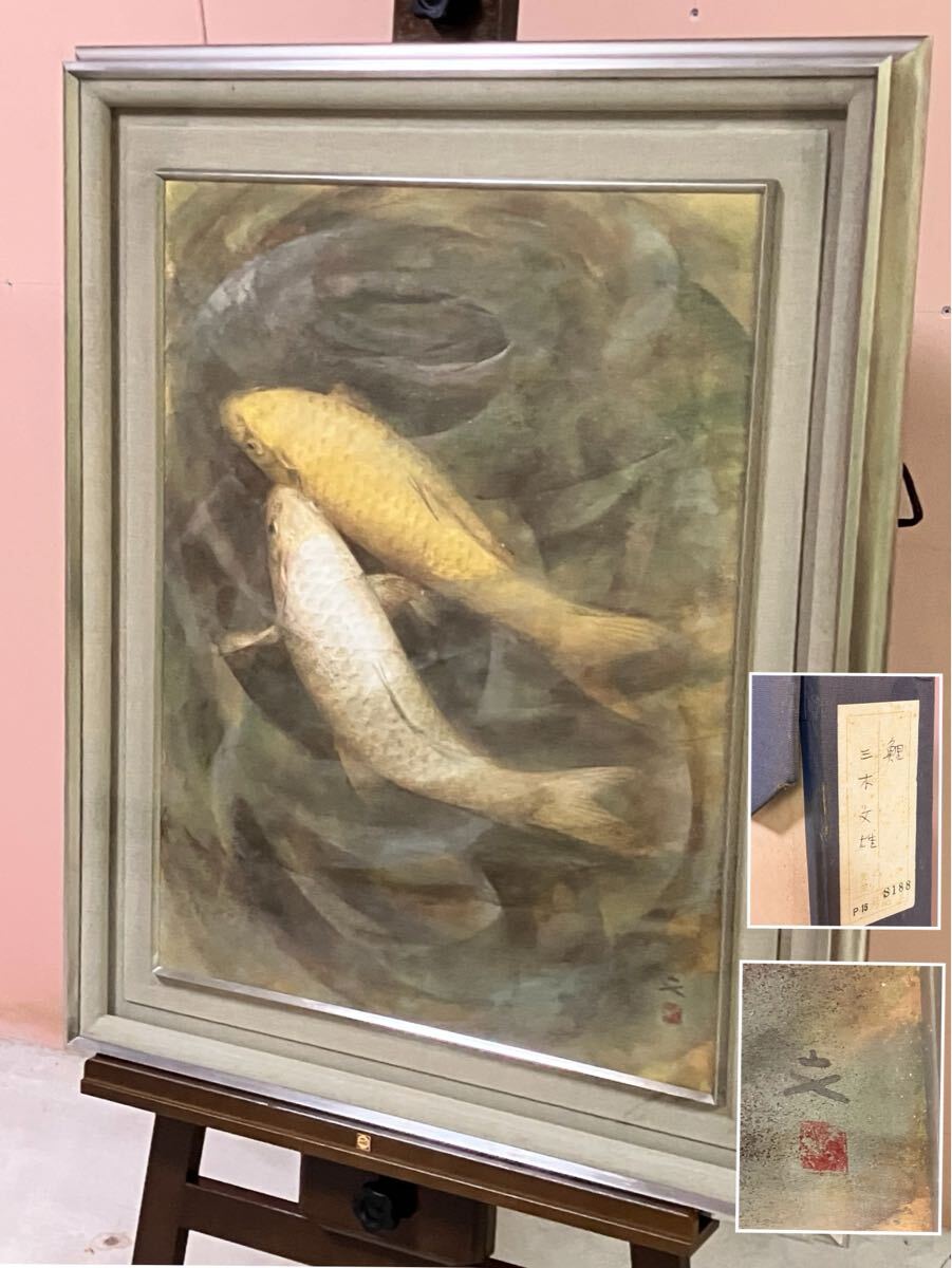 真作 三木文雄『双鯉』水彩画 額装 共箱 共布 絵画