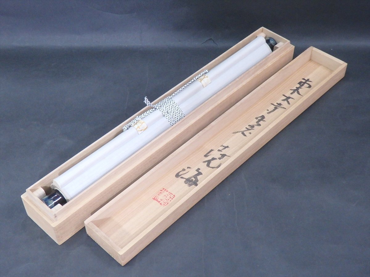 【管理番号5-0513094-8 スタッフコメント:iy】  第209世東大寺別当。写真家としても活躍された異色の僧侶  ☆和紙(絹本の中をくり貫いて貼られています)、肉筆、風帯付き、軸先は陶器。シミが全体にあります。破れはありません。共箱入り。