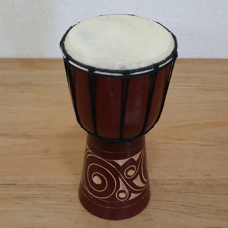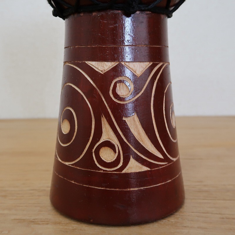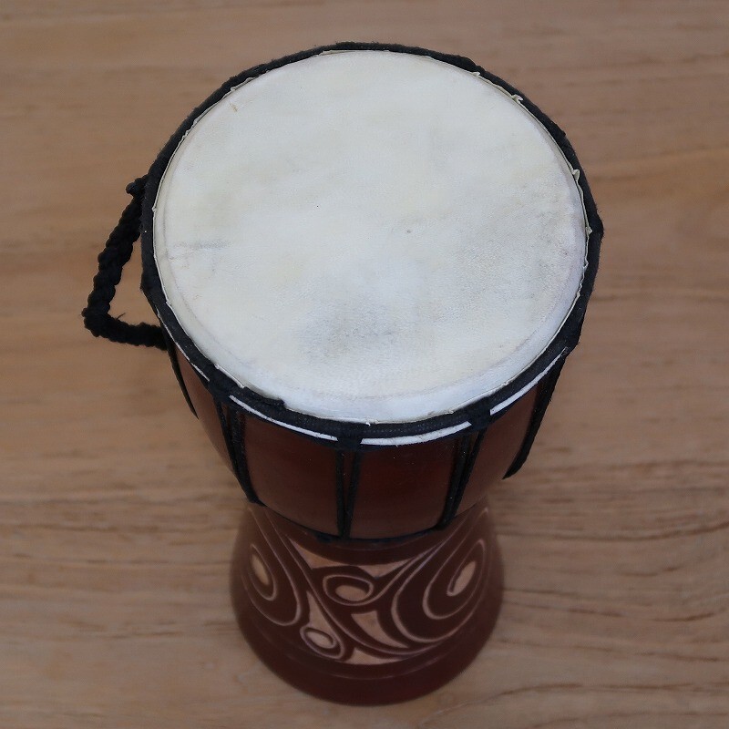 一本のマホガニの木を削って作った彫刻がオシャレなジャンベです。叩くとポコンポコンと音が出ます。インテリアとしてもお勧めです。