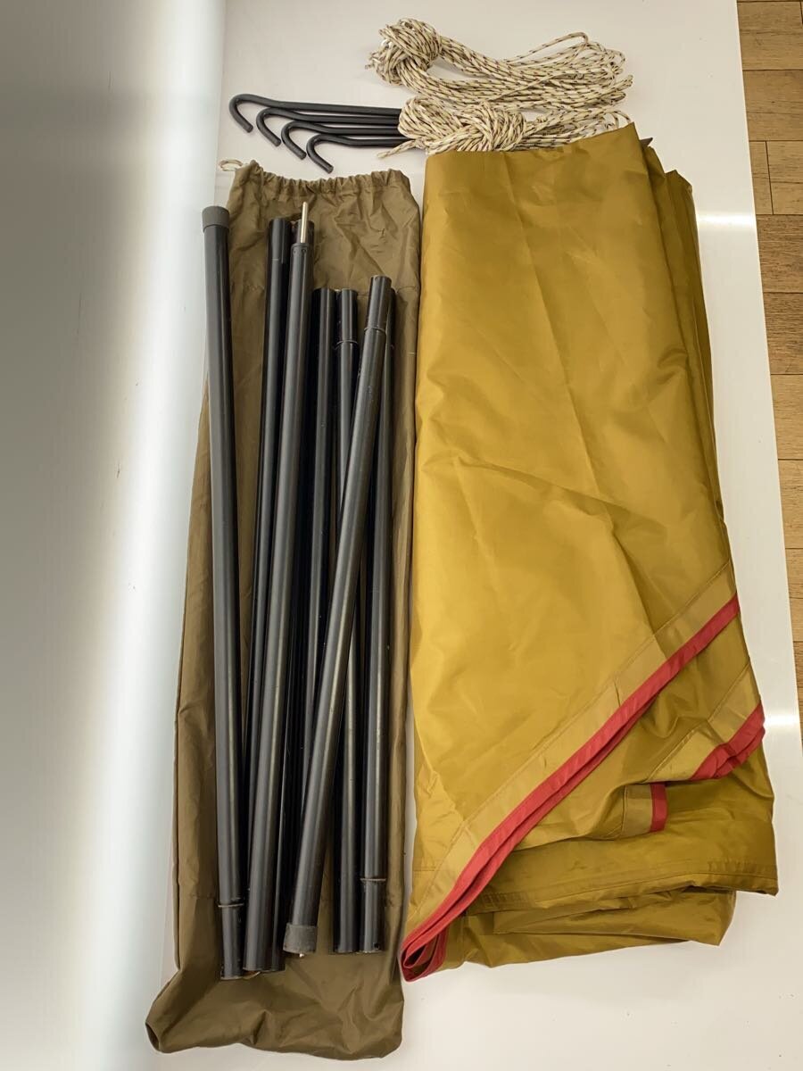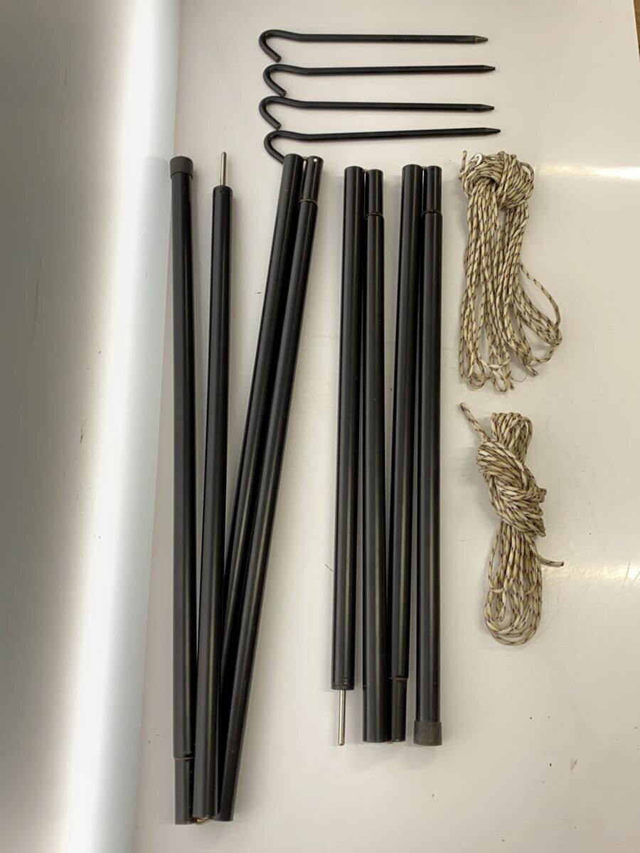 | ・スチールポール×2 ・スチールペグ×4 ・ロープ×6 ロープ4本はタープ本体に装着されております。 全体的に穴、汚れ等使用感のあるお品物です。 画像をご確認ください。 |