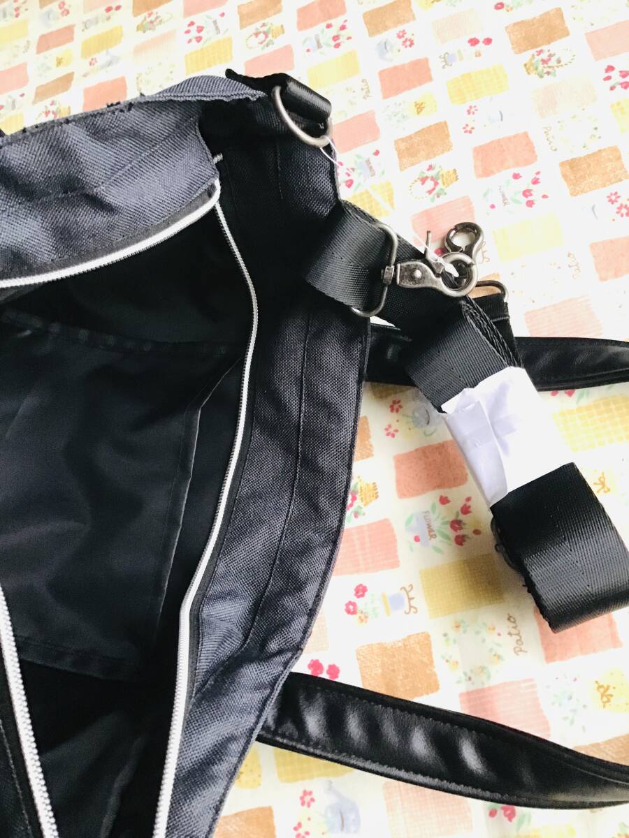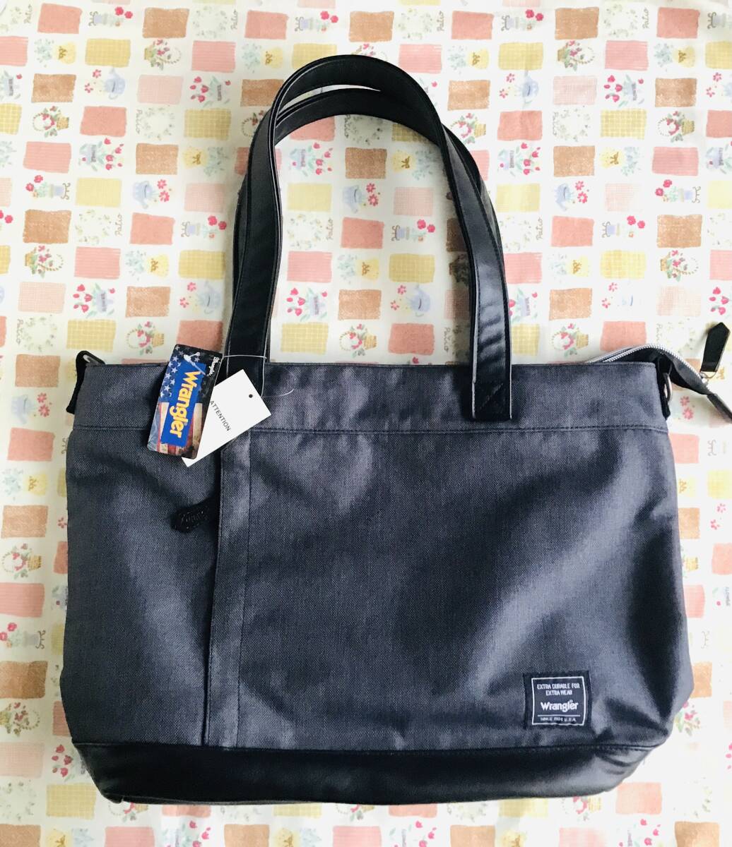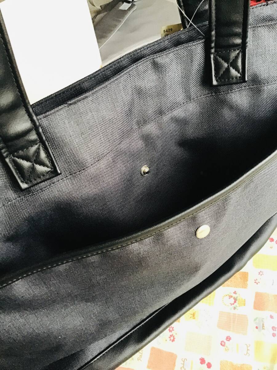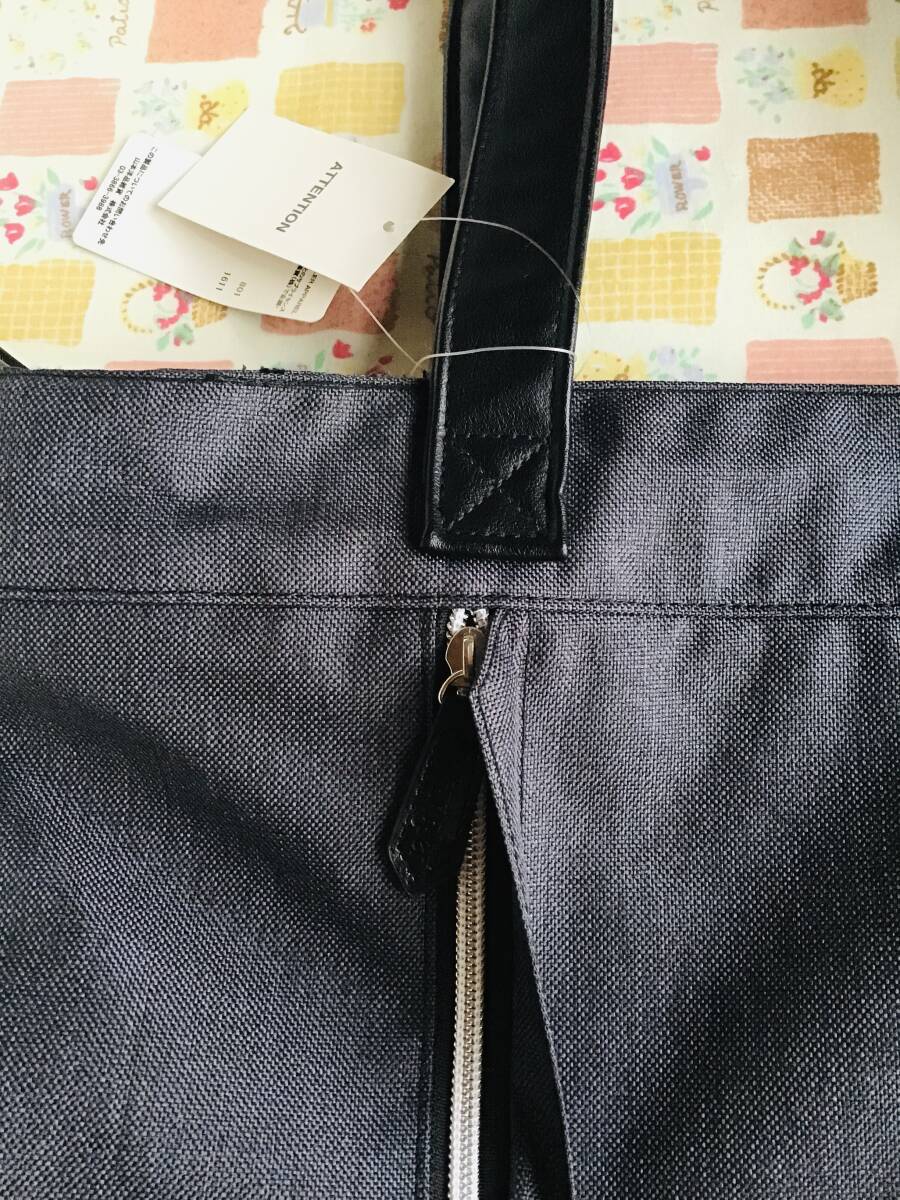 本体は濃いグレーでポリエステル、持ち手と底の部分は合成皮革です。