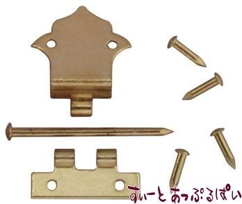 ドールハウス用の蝶番です。写真の通りが1セットで、商品は6セット入りになります。写真には写っていないのですが、もう1本短くて細い金属棒がセットになっており、その棒にフラットな金具の輪の部分を通して使います。写真中央の長い釘は、使っても使わなくても良いのですが、ドアのストッパー(ある程度以上開かなくするための道具)だと思われます。とにかくすべて小さいので、パッケージを開ける時はご注意ください!ビニール袋の中で開けると良いかも知れません。鼻息でも飛んでいきますので、要注意です!!小さすぎて取り付けが大変なので、釘は使わずに接着してもよいかも知れませんね。メーカー:クラシック(米国)、生産国:中国。写真上部のパーツ:5x6mm、長い釘の長さ約10mm、短い釘の長さ約3mm