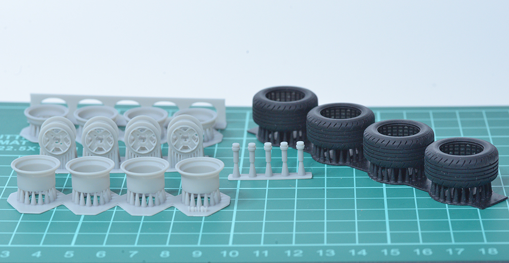 ・3D出力パーツ 1式4本分(ホイール3ピース構造、タイヤ、ホイールナット、センターキャップ兼取付軸、バルブ、簡易ブレーキディスク)
