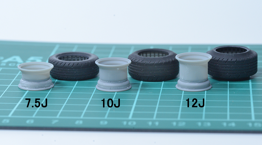 カーモデルへの装着例ではフロントに10J、リアに12Jを装着しています