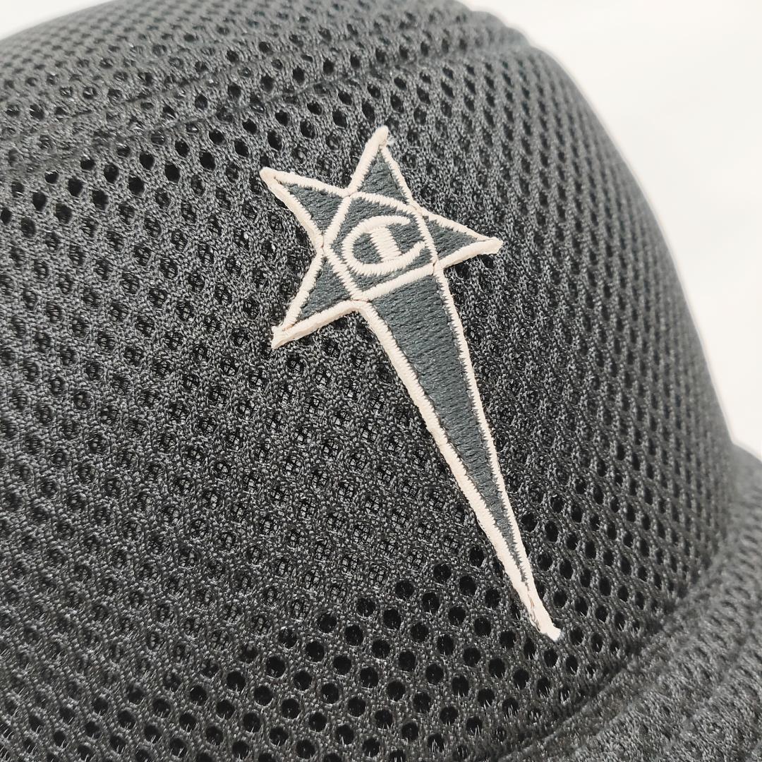 フロントに小さな3Dのチャンピオン×リック・オウエンスのペンタグラム・ロゴパッチがあしらわれている総メッシュ仕上げ、機能性重視のバケットハット。