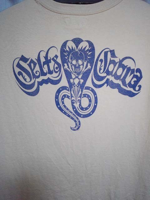 ケルト&コブラのTシャツです。サイズはS(身幅45cm 着丈61cm)素人採寸の為多少の誤差はお許し下さい。状態は全体的に使用感あり。プリントはネイビーです。当時定価\10,000位。ノークレーム・ノーリターン・ノーキャンセル,送料は別途ご負担お願いします