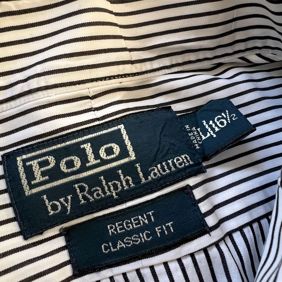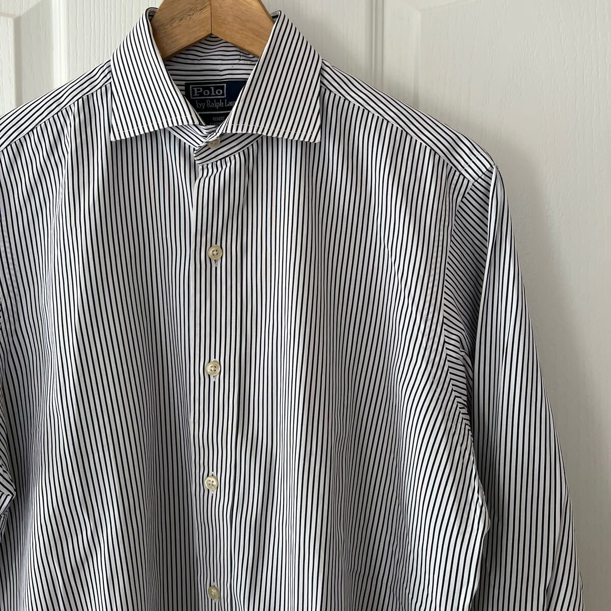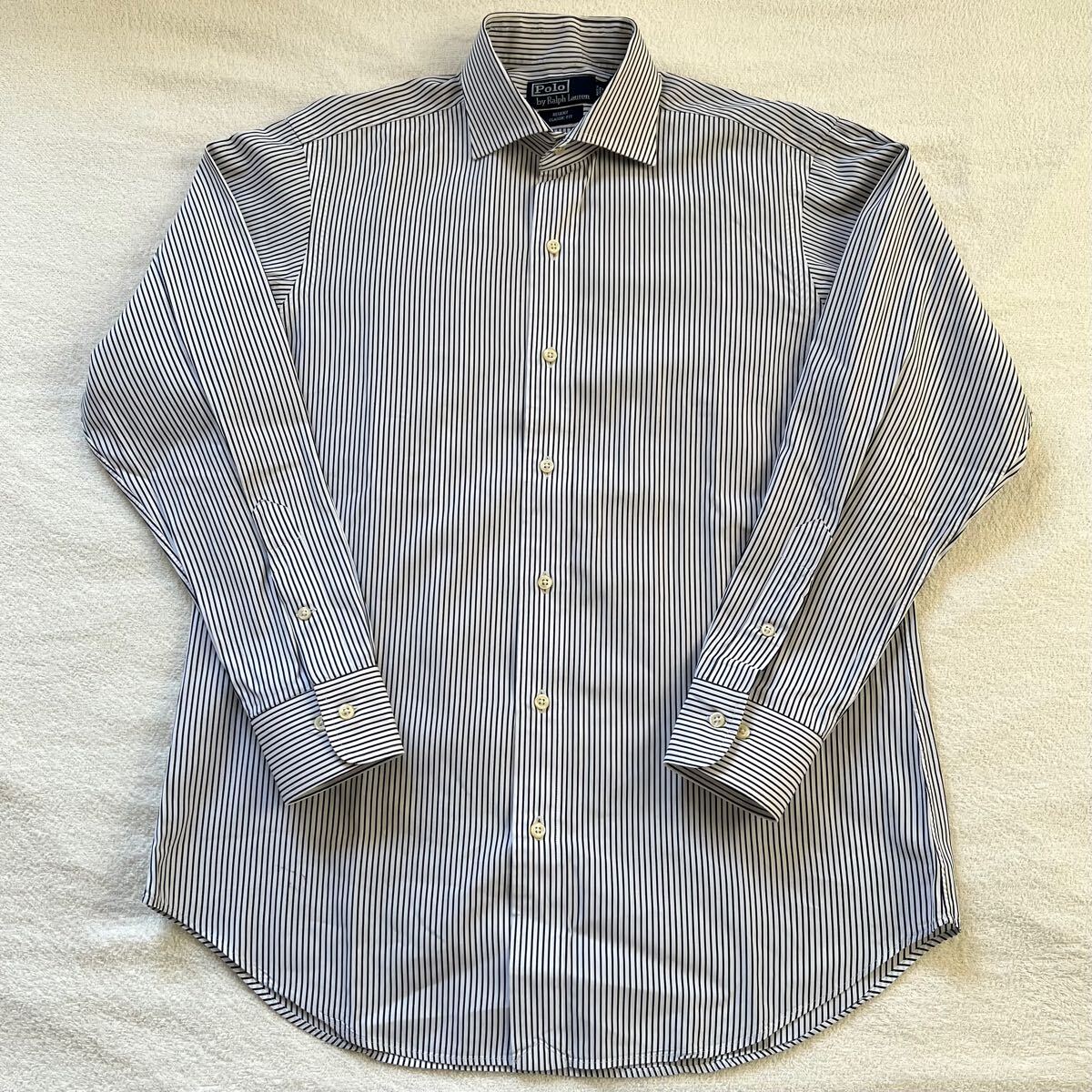 定番のRalph Laurenのストライプ 長袖シャツ(ワイシャツタイプ)です。ホワイト×ブラックの配色で大人の方にもおすすめの一枚。