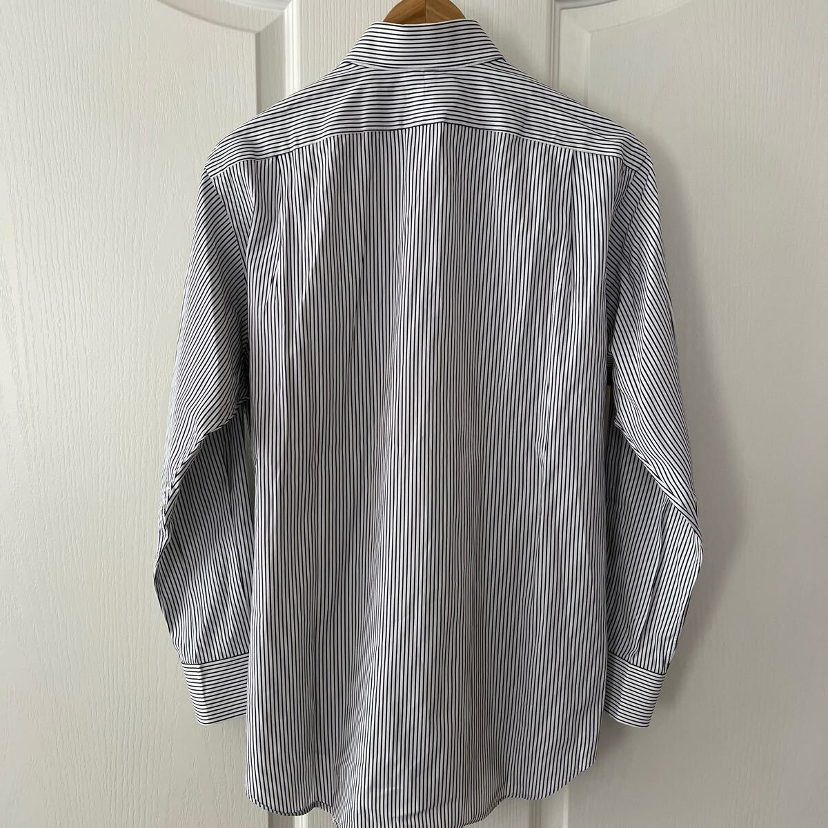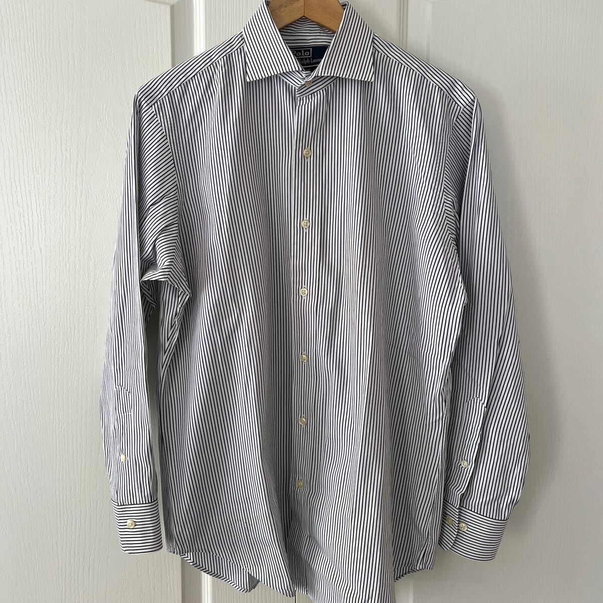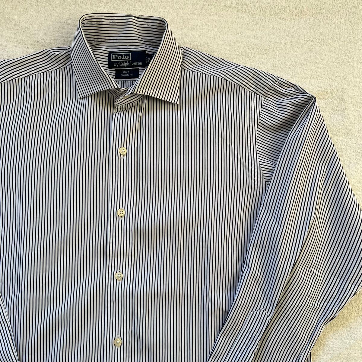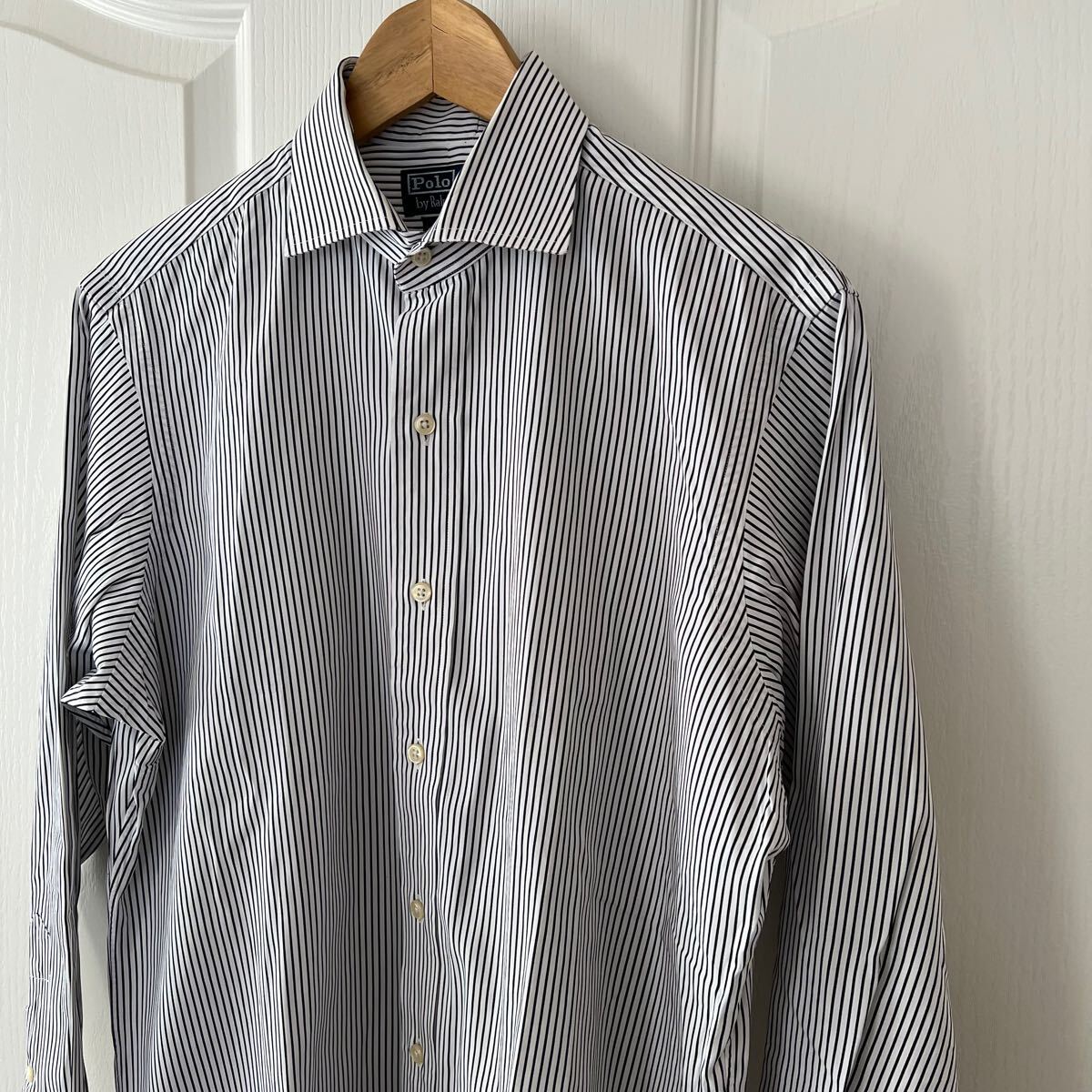定番のRalph Laurenのストライプ 長袖シャツ(ワイシャツタイプ)です。ホワイト×ブラックの配色で大人の方にもおすすめの一枚。