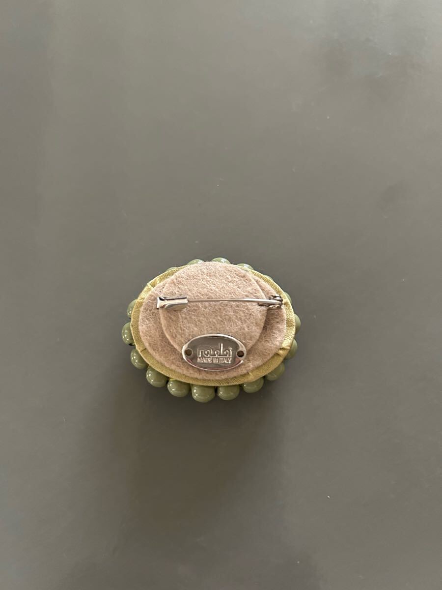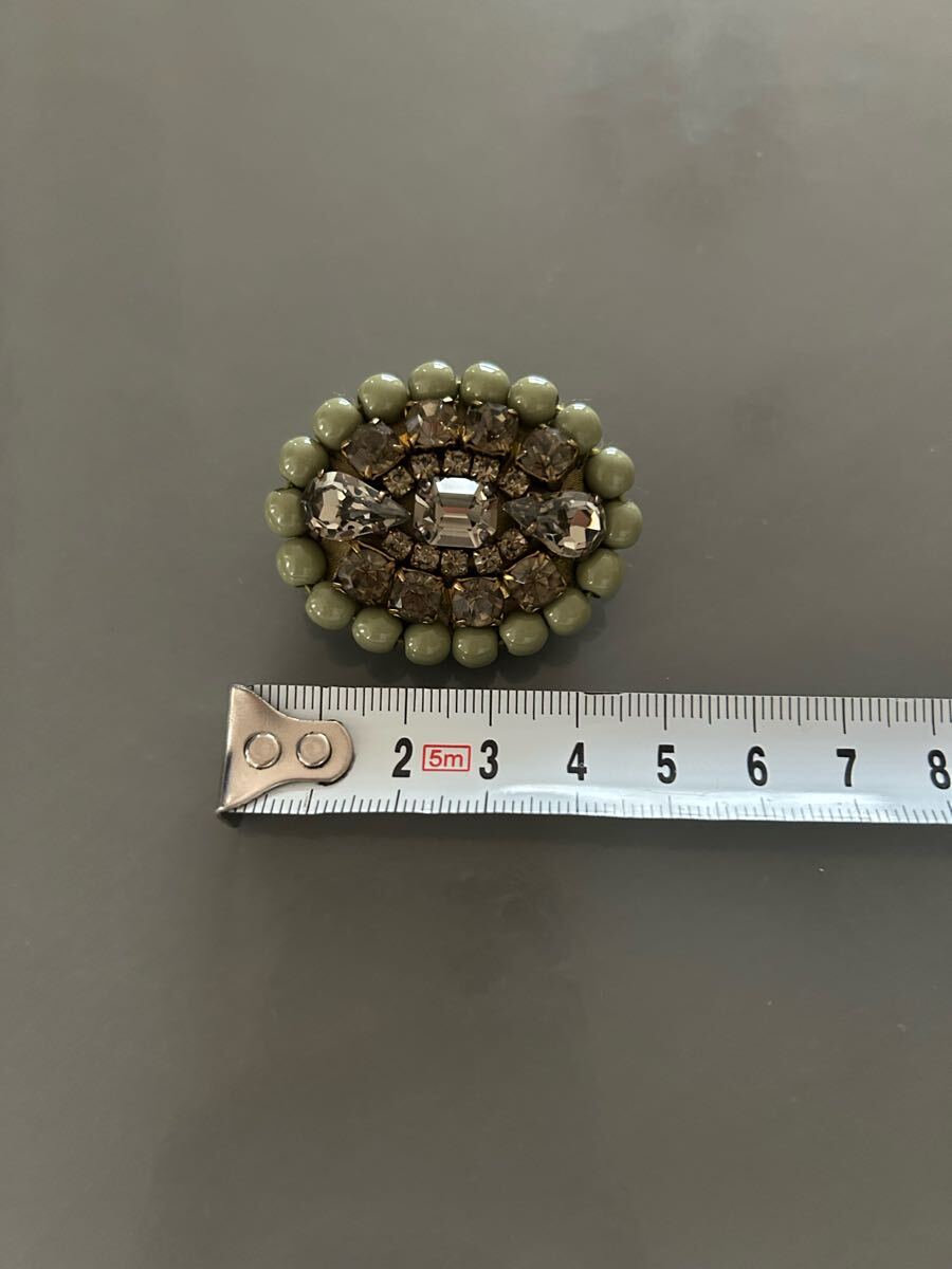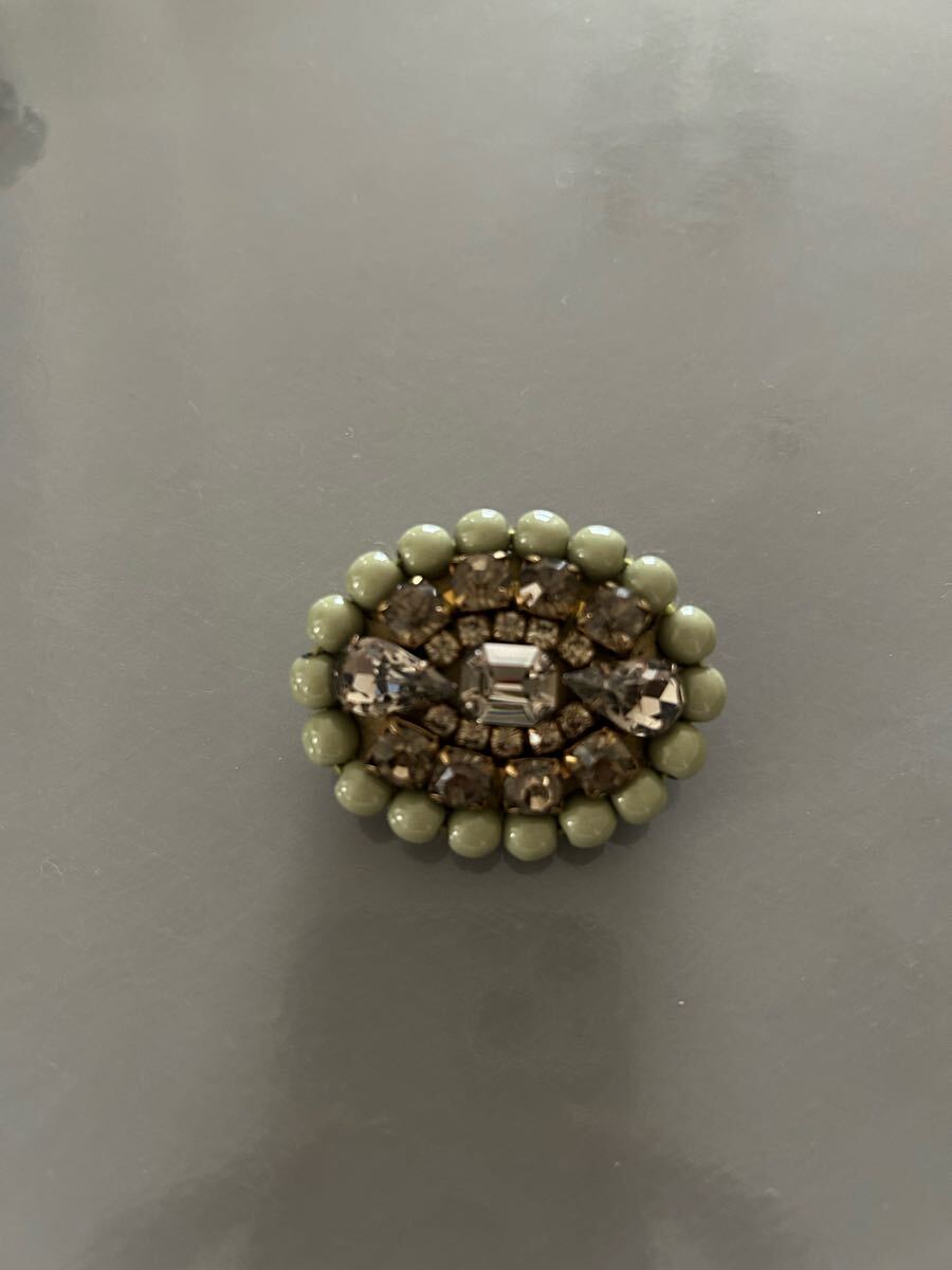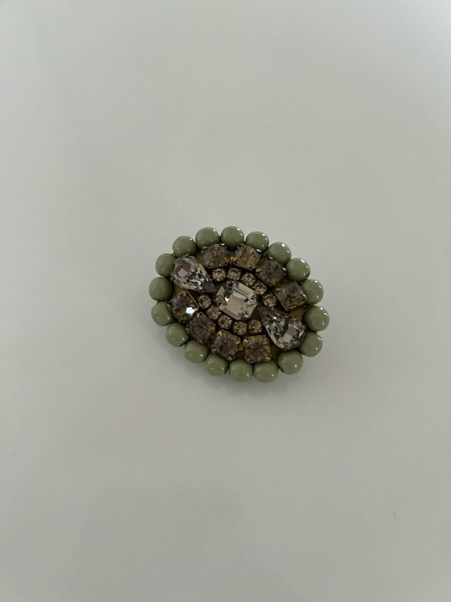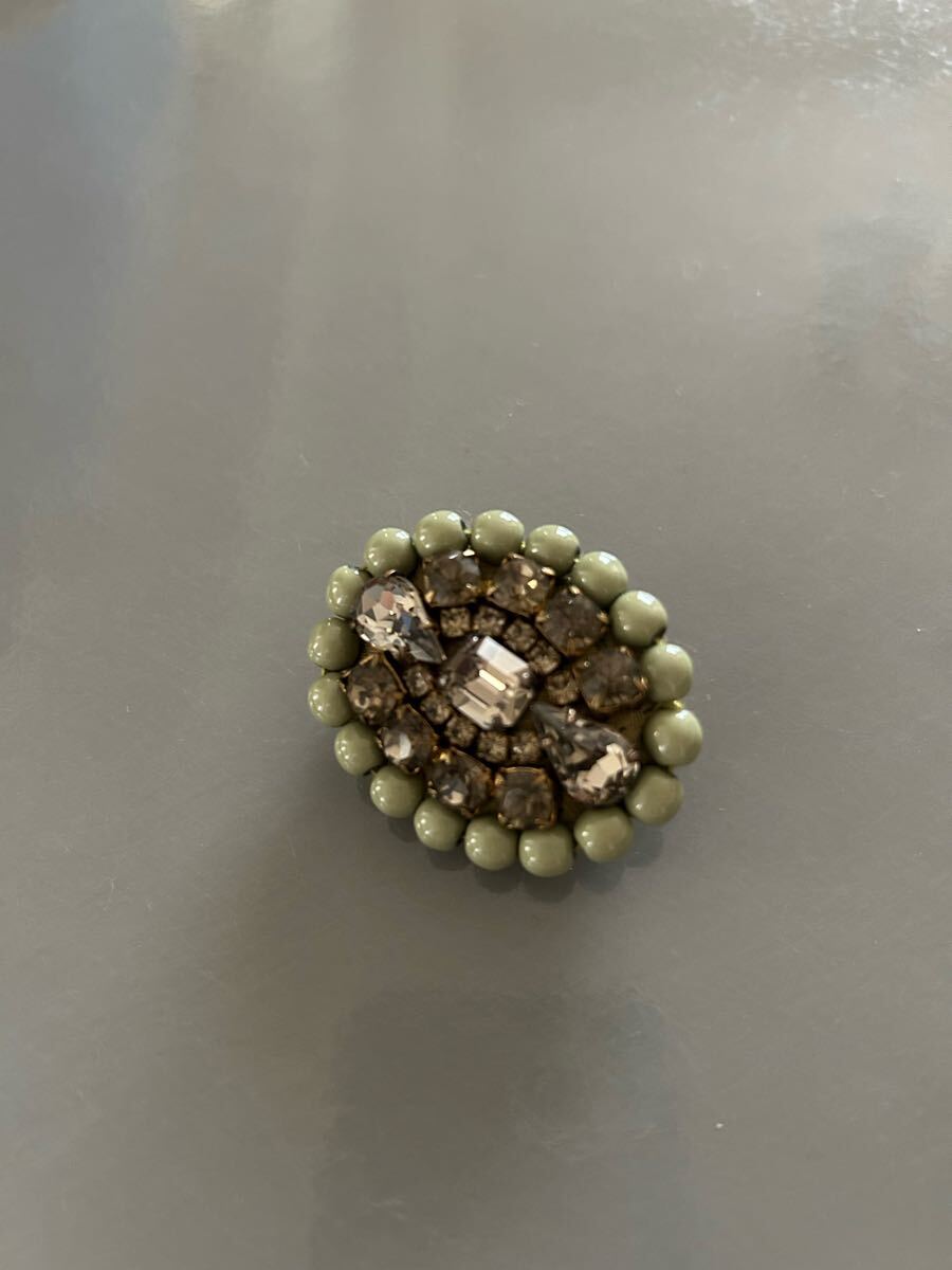 落ち着いたミントグリーンのパーツ、クリアとブラウンのビジューがたくさん散りばめられています。