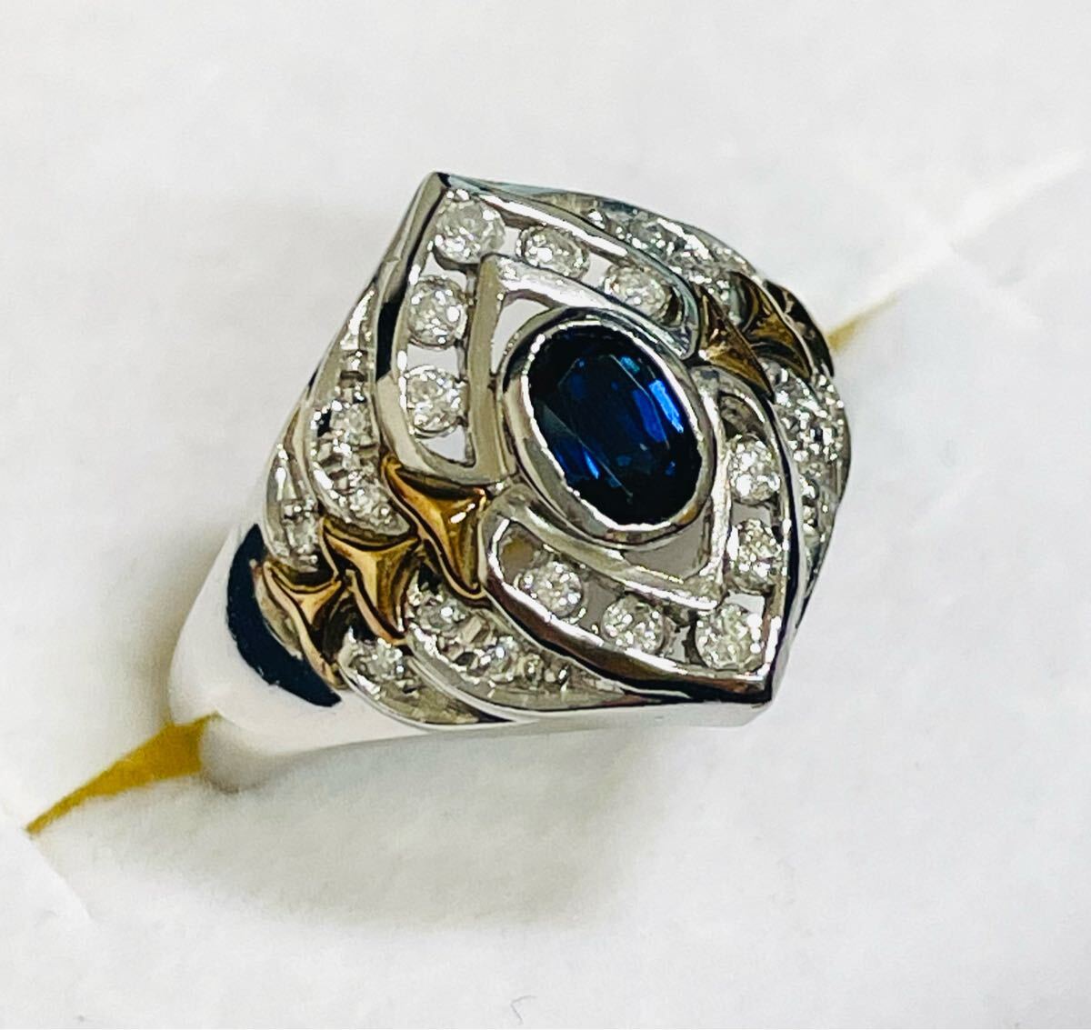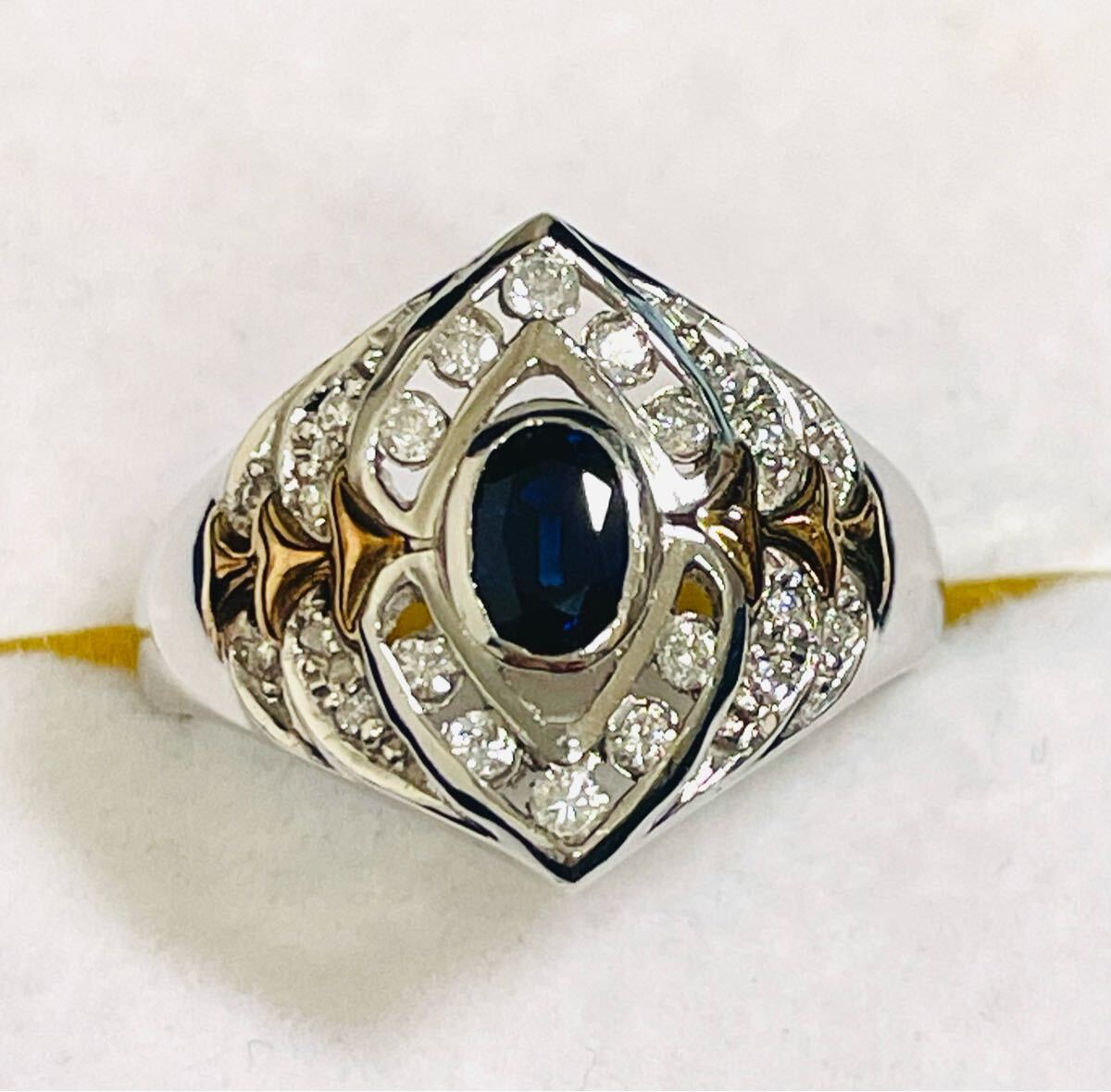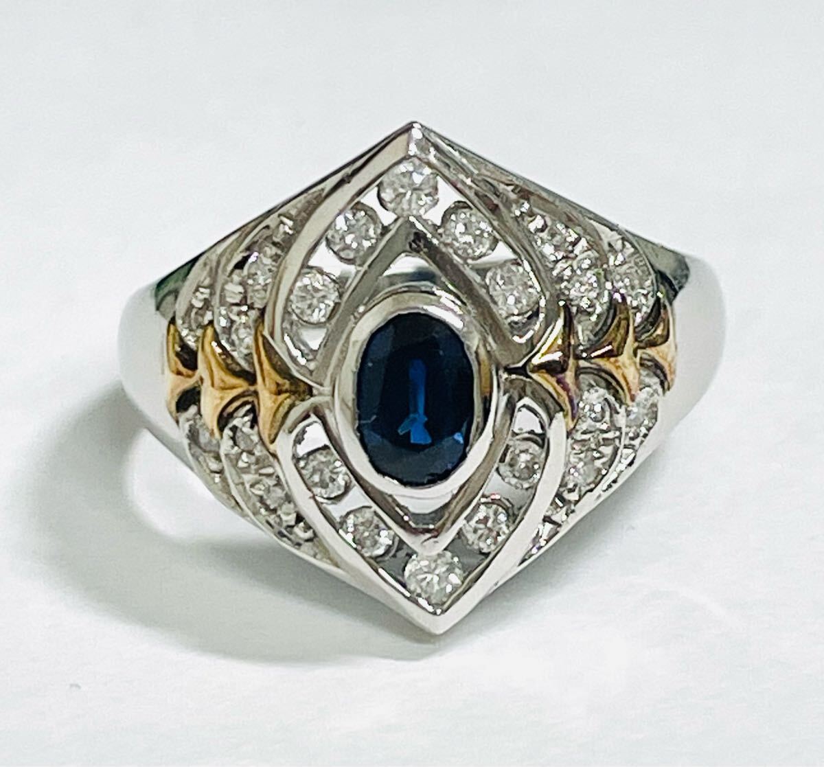 こちらは、Pt900/K18台にサファイア1石&ダイヤ22石付きリングです。