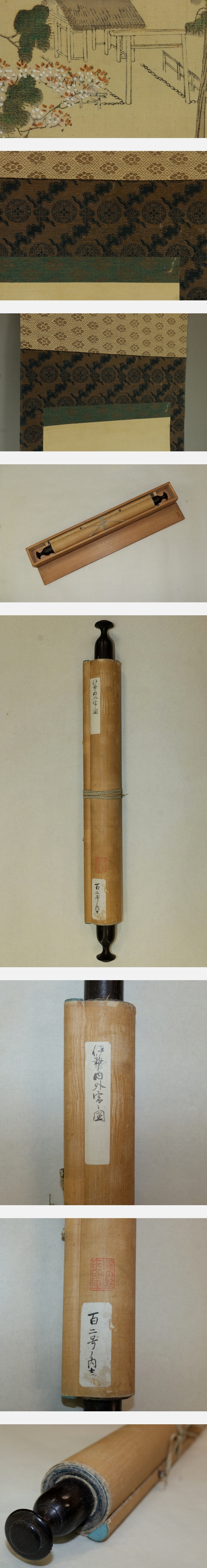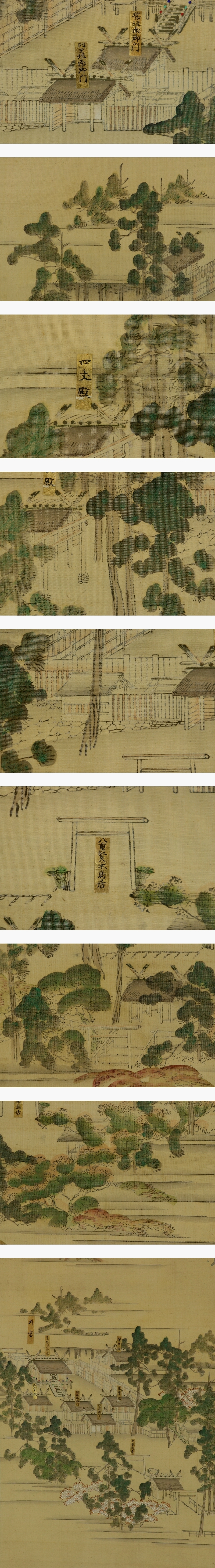 細密画【伊勢両宮殿舎之図】 本紙は、染み、汚れ、軽い皺、虫食い、擦れがあります。 表装は、染み、汚れ、折れ、皺、虫食い、破れ、ほつれ、修理痕があります。 【サイズ】 作品 横約31cm×縦約99cm 表装 横約40cm×縦約176cm |