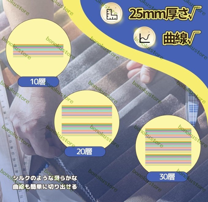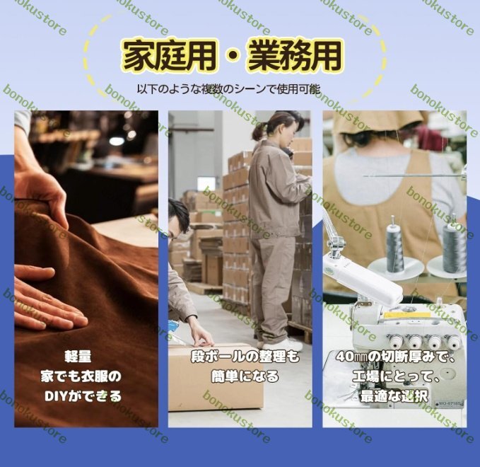 「切断厚み25mm」衣装、革製品、織物、製傘業、帽業などの企業に広く使用されている。25mmまでの厚い布が切れます。