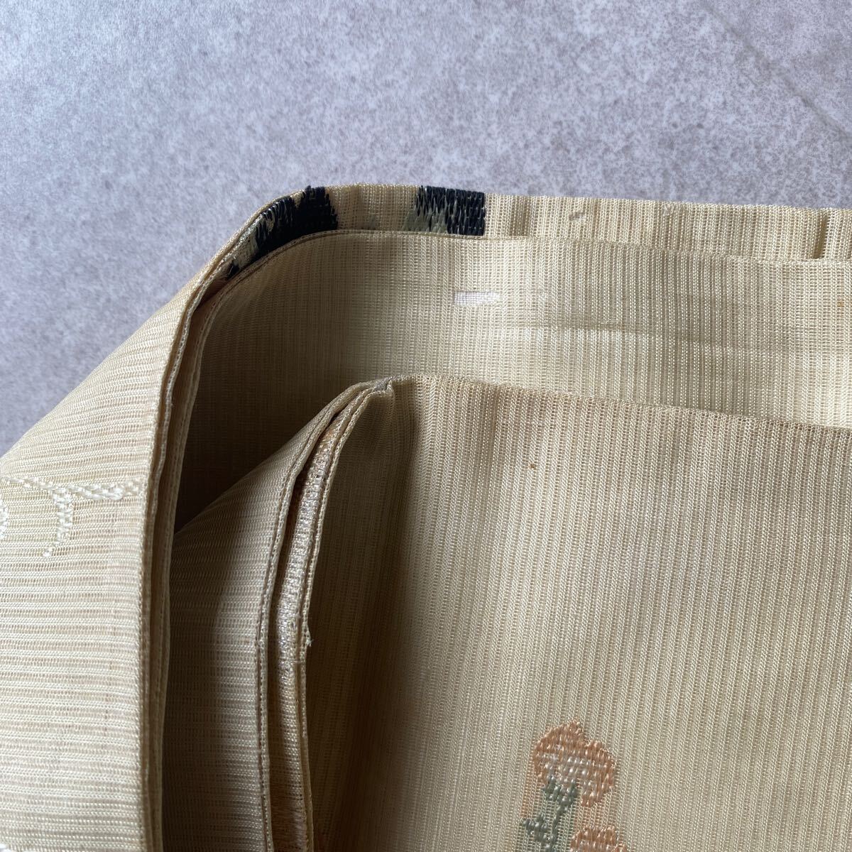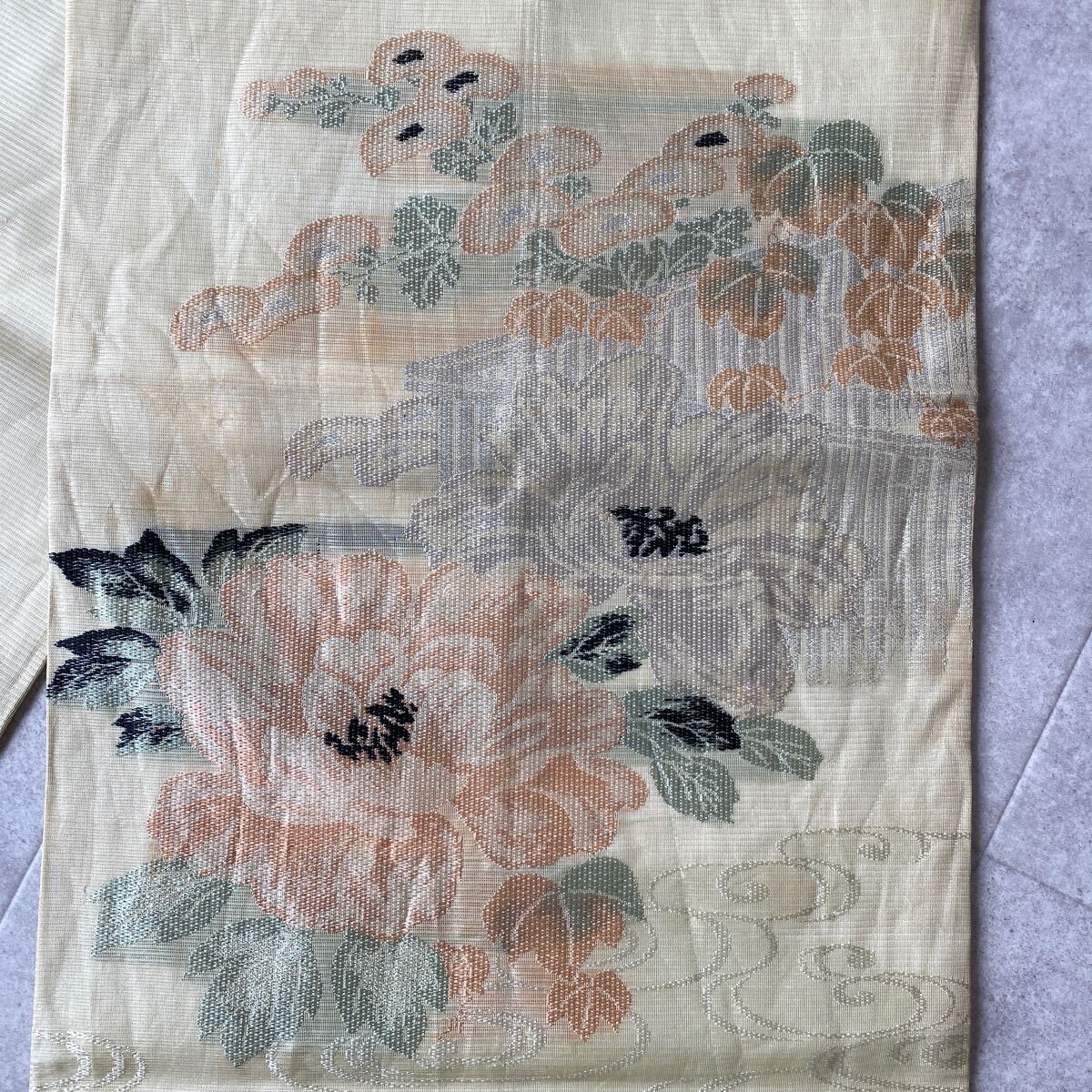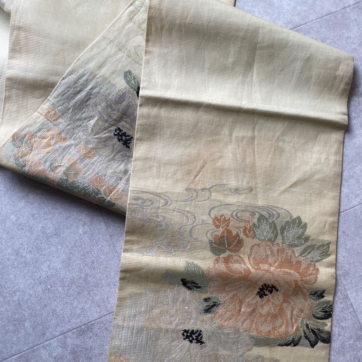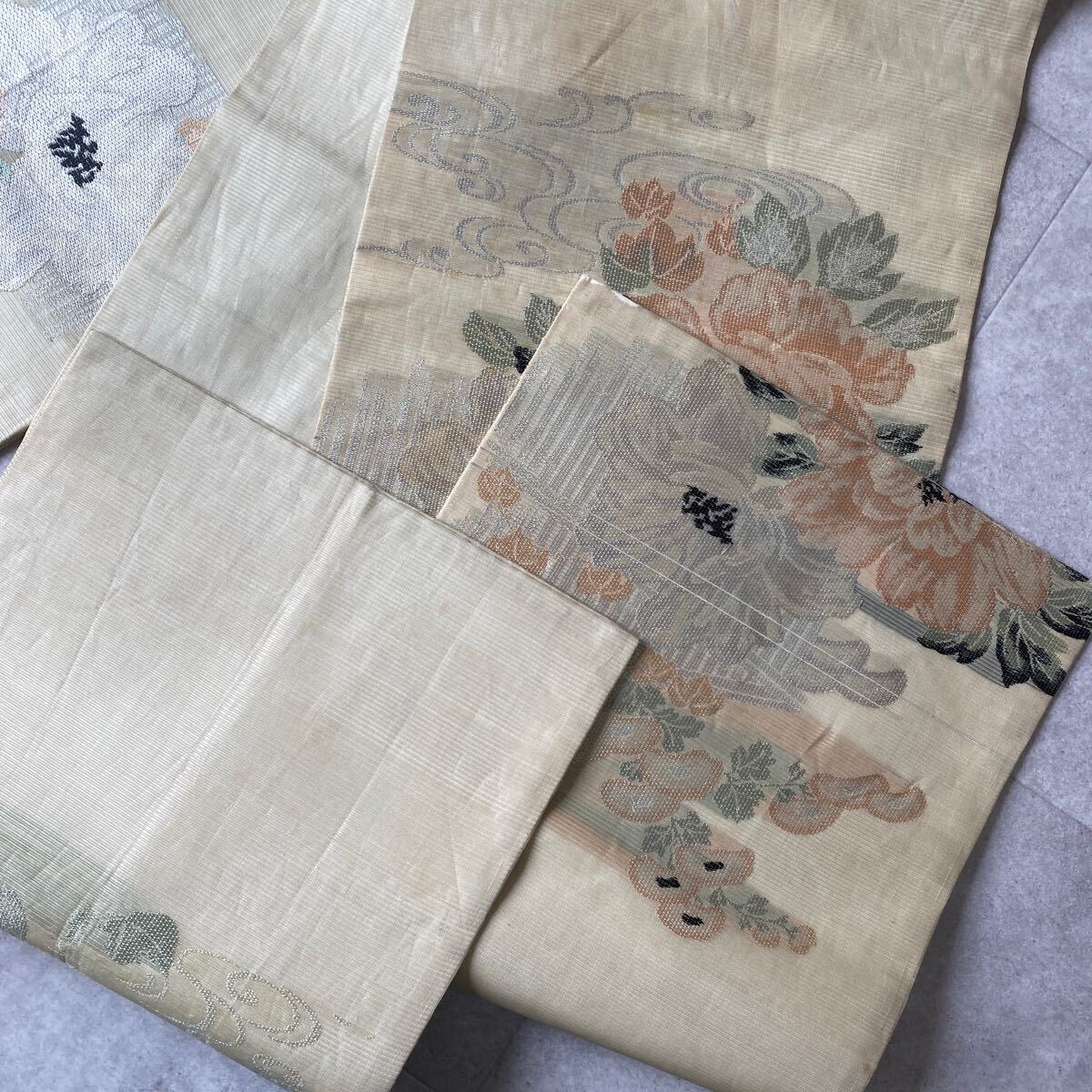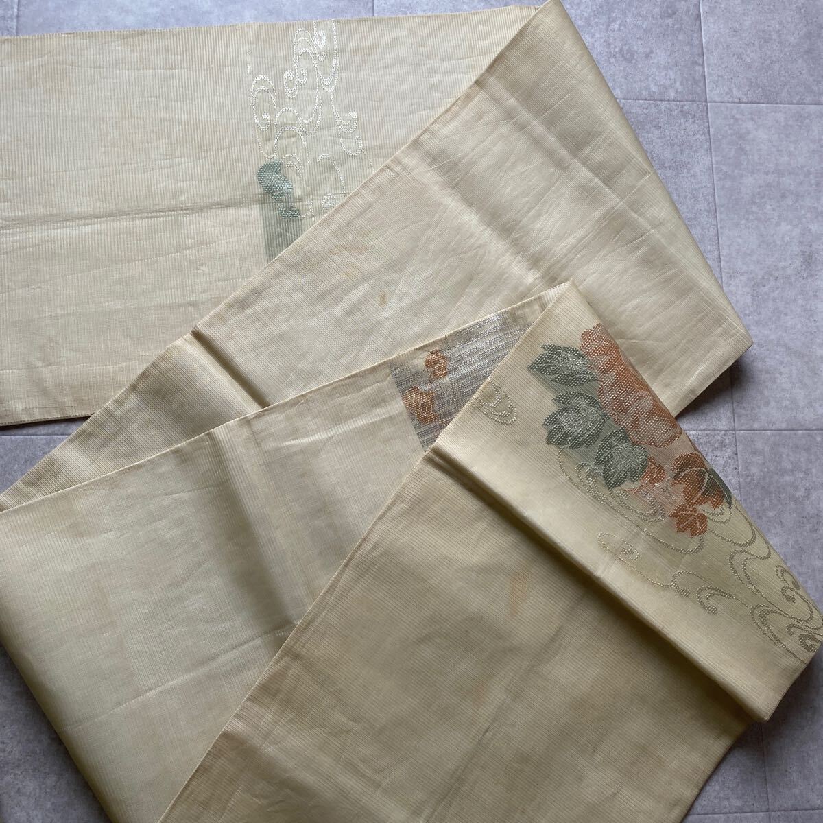 アンティーク 袋帯 絽 紗 夏帯 夏物 着物 昭和レトロ 大正ロマン モダン 和洋折衷コーデ リメイク 花 たまご色 銀糸 お21-17w