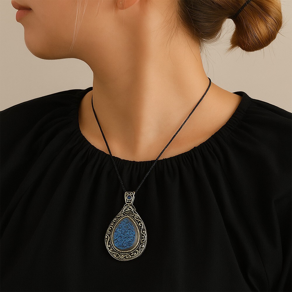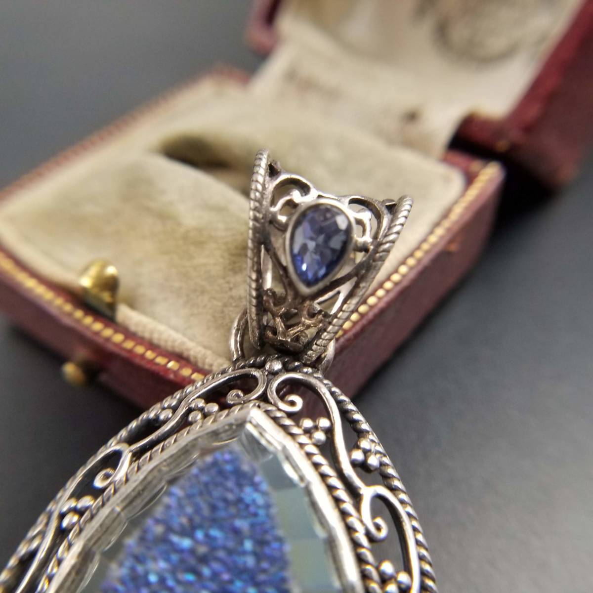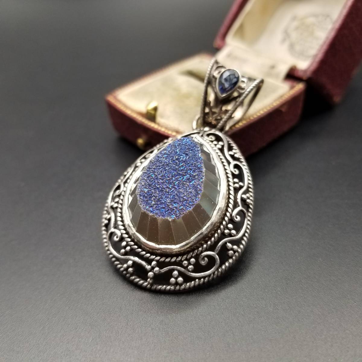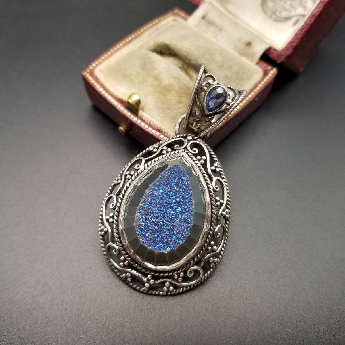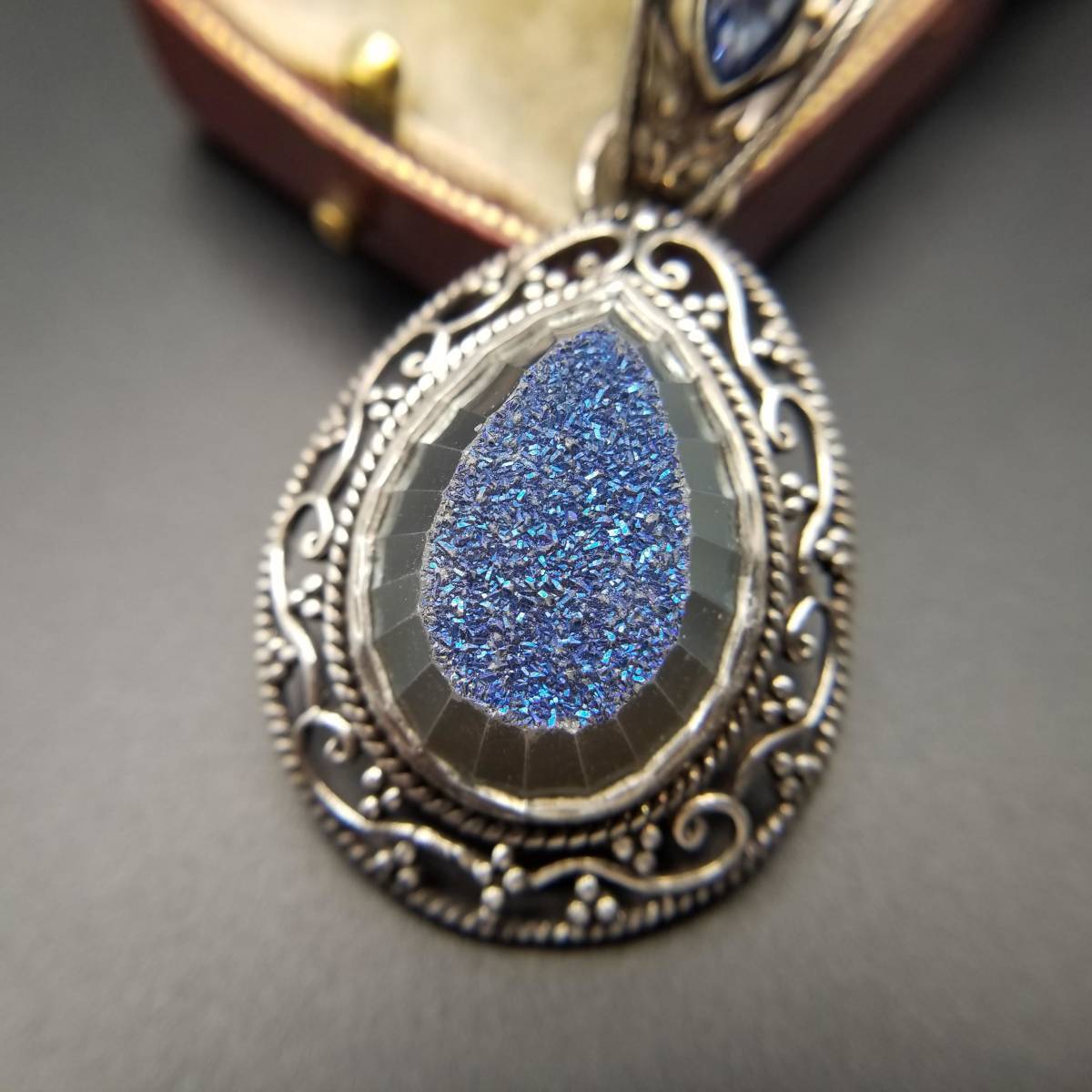Sajen ドゥルージー 結晶 ブルー ペア型 925 シルバー ヴィンテージ チャーム ペンダント 銀フレーム 装飾 アールデコ 紺碧 ドロップ YAU①