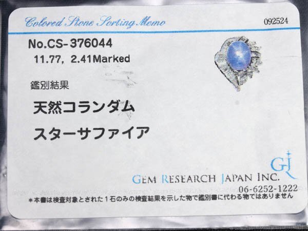 ◆安心の品質!!!【GEM RESEARCH JAPAN INC.】発行ソーティング付き!!! 豪華絢爛!!! 上質非加熱スターサファイア 特大11.77ctと、極上ダイヤモンド 総計2.41ctを贅沢に宝飾した、超高級リングをご紹介いたします!!! 光源下で六条のスター効果が現れる神秘の宝石 スターサファイア!!! こちらは11.77ctの特大サイズで、ハッキリと現れるスター効果と透明感溢れる輝きが美しい上質非加熱スターサファイア!!! 市場に出回るコランダムの90%以上が加熱処理を施されている為、この特大サイズでこの輝きの上質な非加熱スターサファイアは大変魅力的でございます!!! 周囲には、1石1石が瑞々しい輝きを放つ極上ダイヤモンドを、なんと総計2.41ctも贅沢に宝飾!!! 極上ダイヤ 総計2.41ctものボリューム溢れる輝きが、特大の上質非加熱スターサファイアを一際華やかに輝かせます!!! エレガントに創り上げられたリングデザインには、高級素材Pt900を使用!!! プラチナの質感が、より一層の高級感を演出します!!! こちら格安での出品となっておりますので、この機会是非お見逃しなく!!! ◆こちらの商品はお客様の希望がある場合のみ、評価をつけております。 評価希望のお客様は、オーダーフォームの要望欄にてお知らせくださいませ。 ◆スターサファイアには、天然のインクルージョンからなるカン・カケ・小傷がございますが、ご着用時に気になるレベルではございません。 |