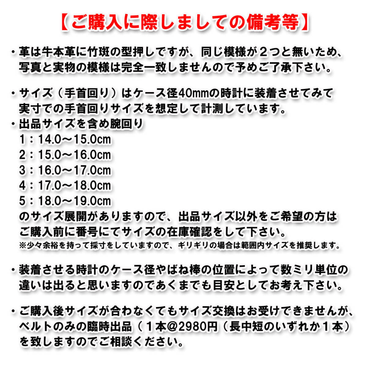 ・革は牛本革に竹斑の型押しですが、同じ模様が2つと無いため、写真と実物の模様は完全一致しませんので予めご了承下さい。