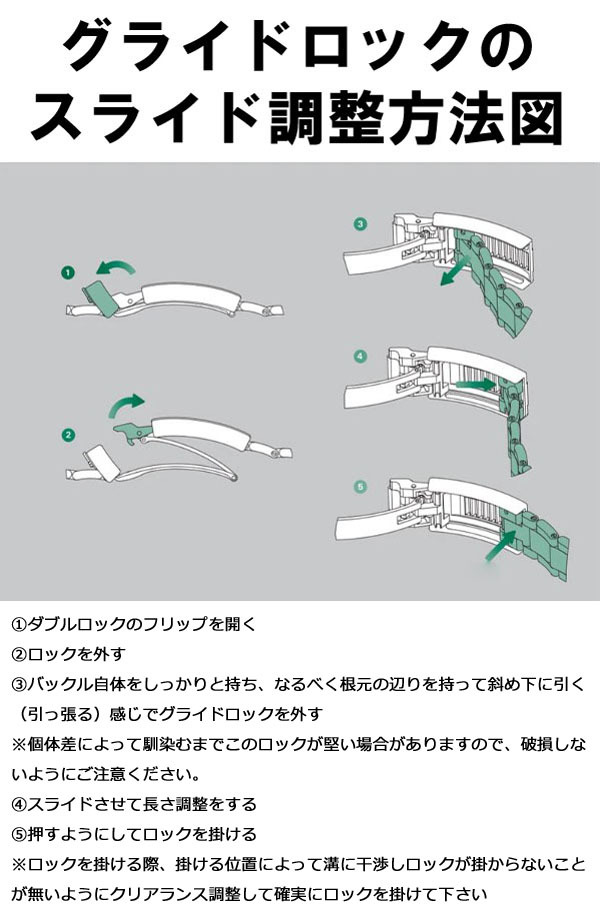 ・バックルはグライドロッククラスプになっていますので約10mm前後の微調整が道具無しで簡単に行えます。