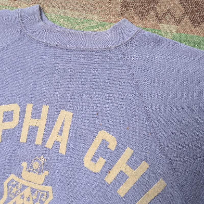 ラベンダー色 【ALPHA CHI】 フロッキープリント 60年代 オールド スウェット シャツ カレッジ ラグランスリーブ ビンテージ 50s60s70s