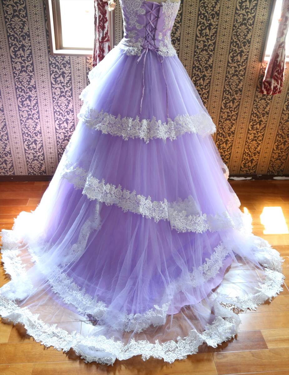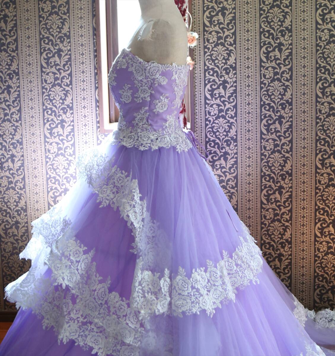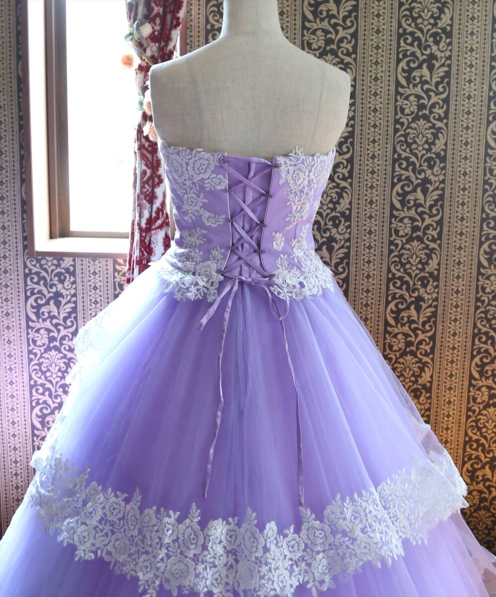 淡いパープルの高級ウエディングドレス7号9号11号S~Lサイズ紫カラードレス編上げ調節可能