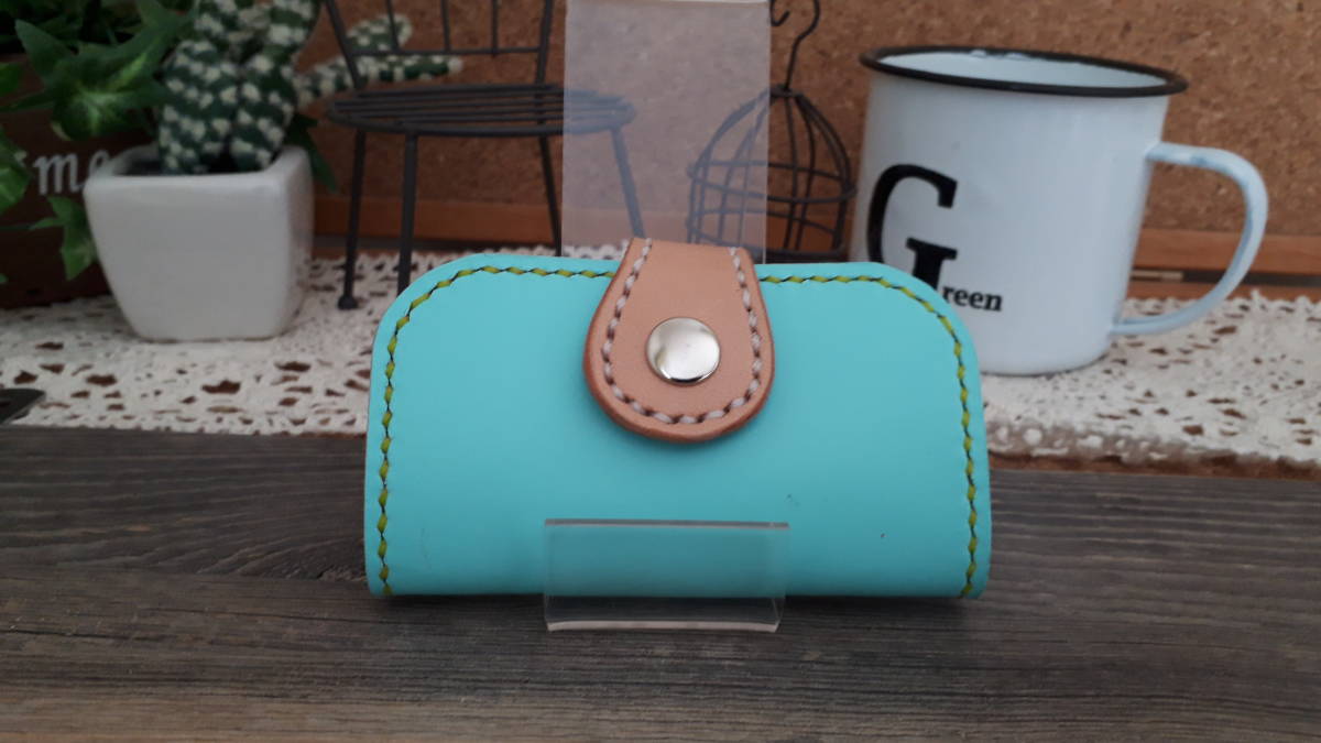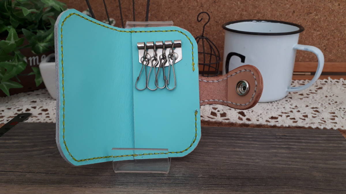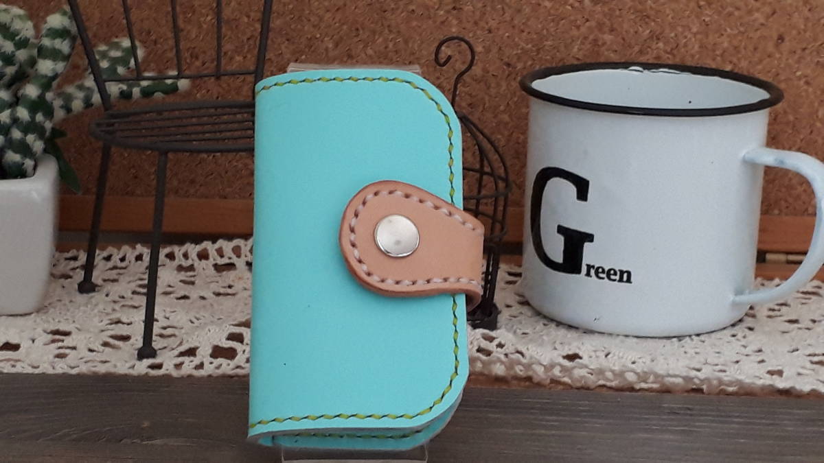 送料込)4連キーケース二つ折*牛革ターコイズブルーY/ハンドメイドレザー