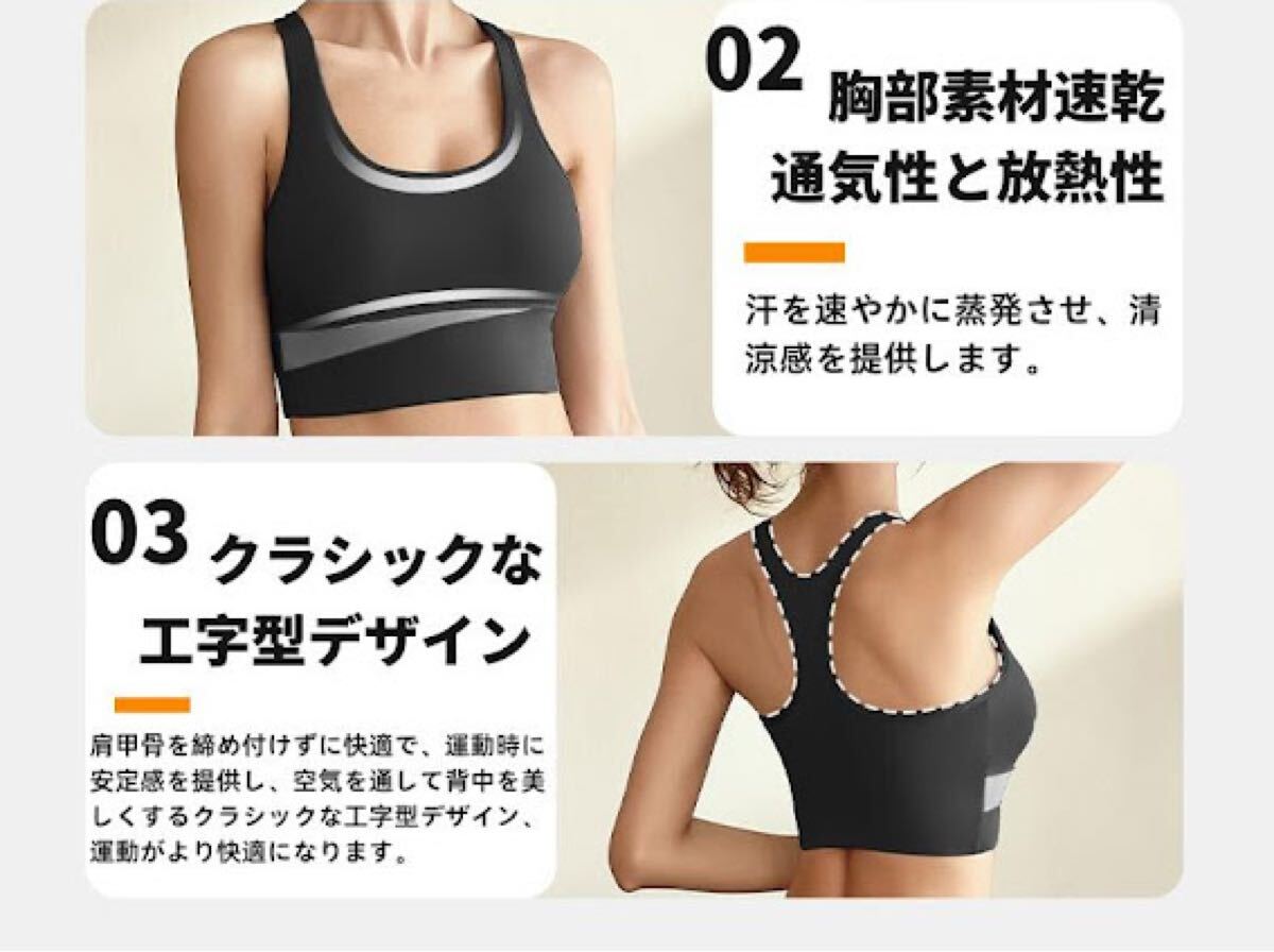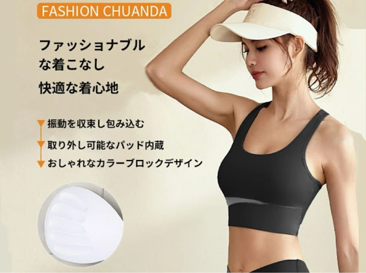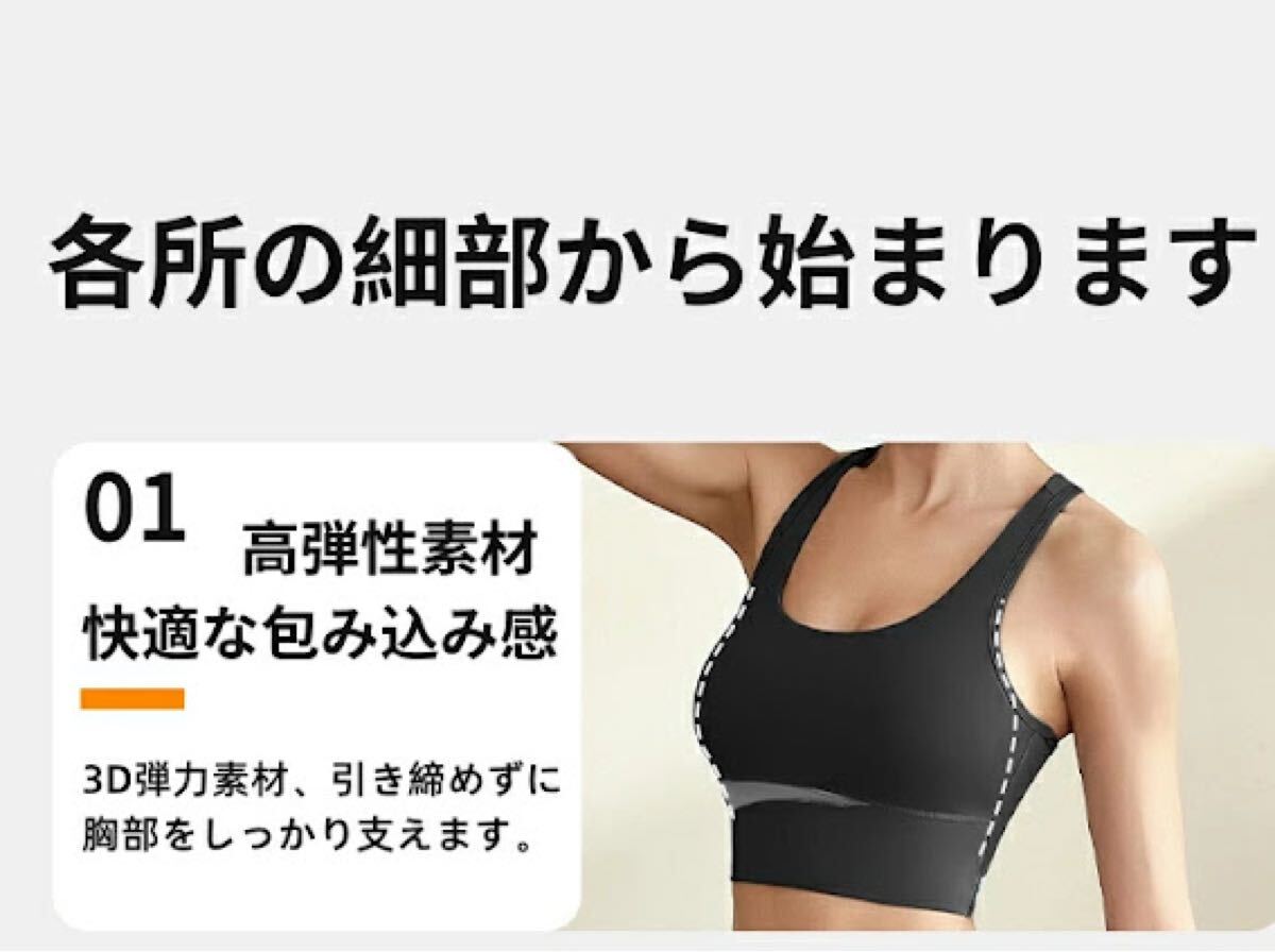 高い弾力性と快適な着心地を提供するブラックのヨガブラ。
