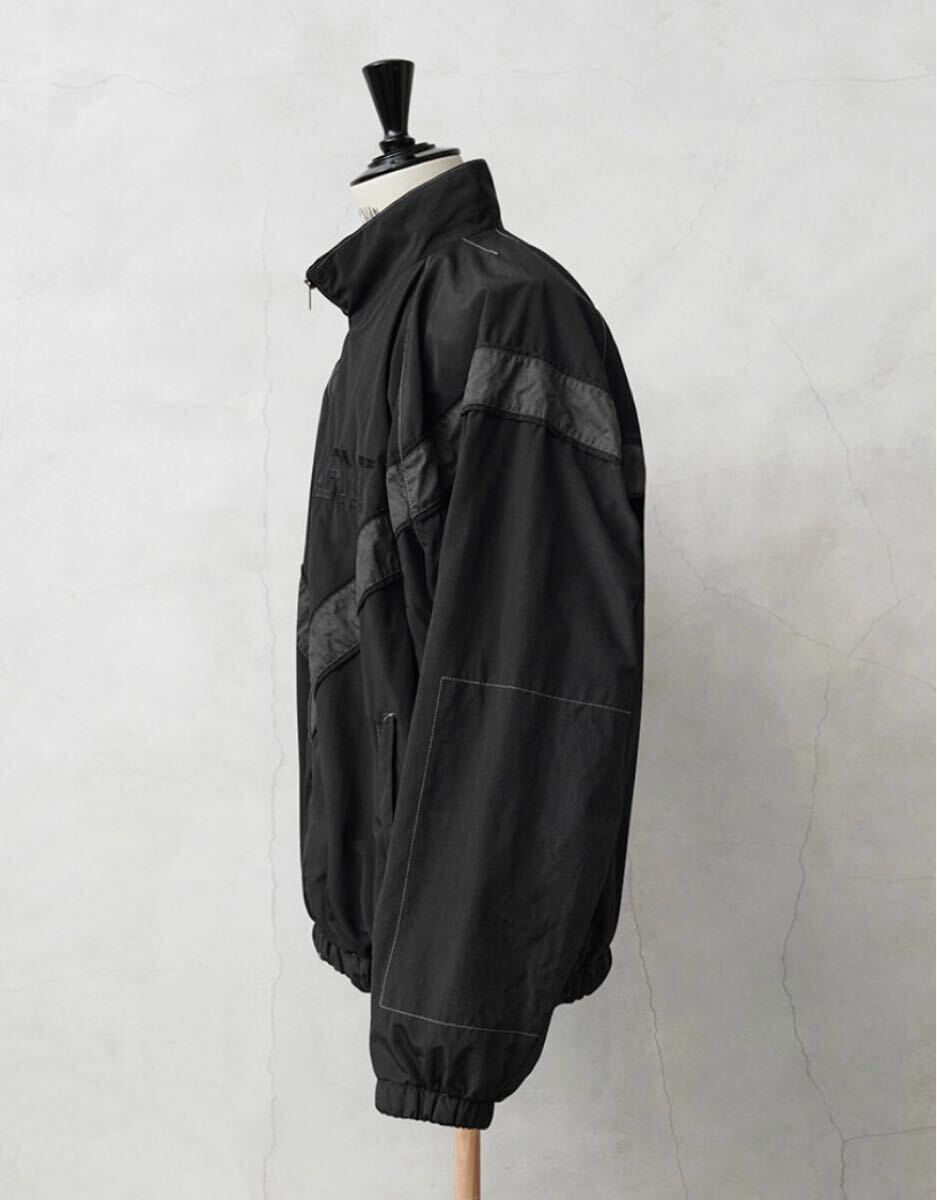 現在は製造されていないこの希少なアイテムを贅沢にDEEP BLACK染めを施しました!BLACKにする事で、グレーとはまた違った雰囲気で存在感のある1枚に仕上がりました!ナイロン素材は、真っ黒に染めることが難しい素材ながら、特殊な染色を行うことで、通常の製品染めに比べても深くしっかりと染まったDEEP BLACK仕様となっています。リフレクターの機能は失うことなく、DEEP BLACKにさり気なくV字のラインが浮かび上がります。
