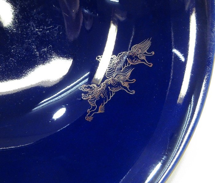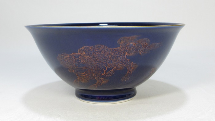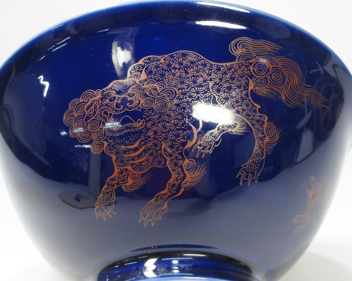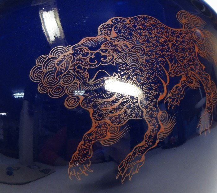 美しい瑠璃の素地に金彩の獅子が細かく描かれています。