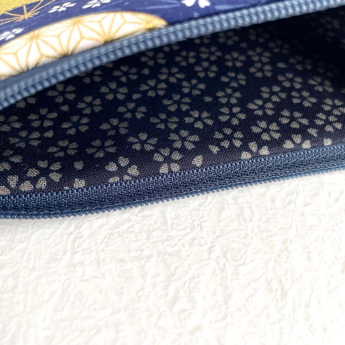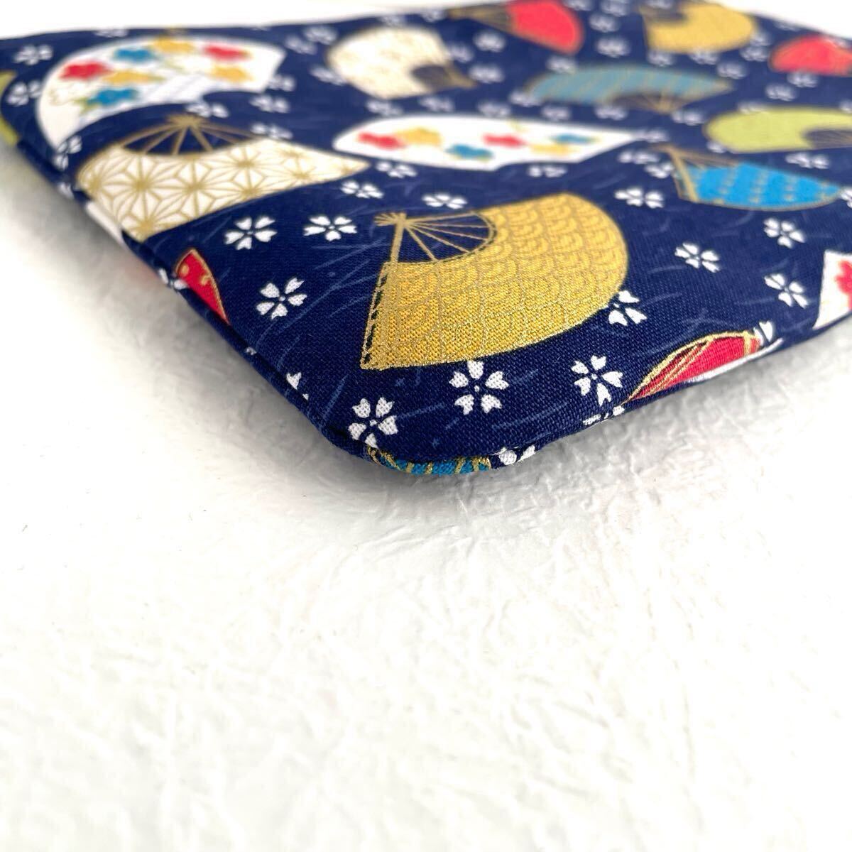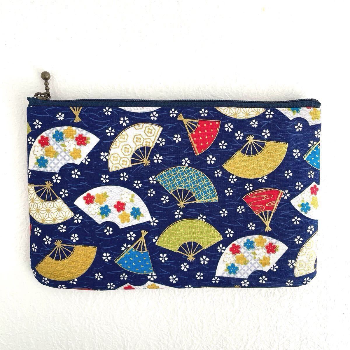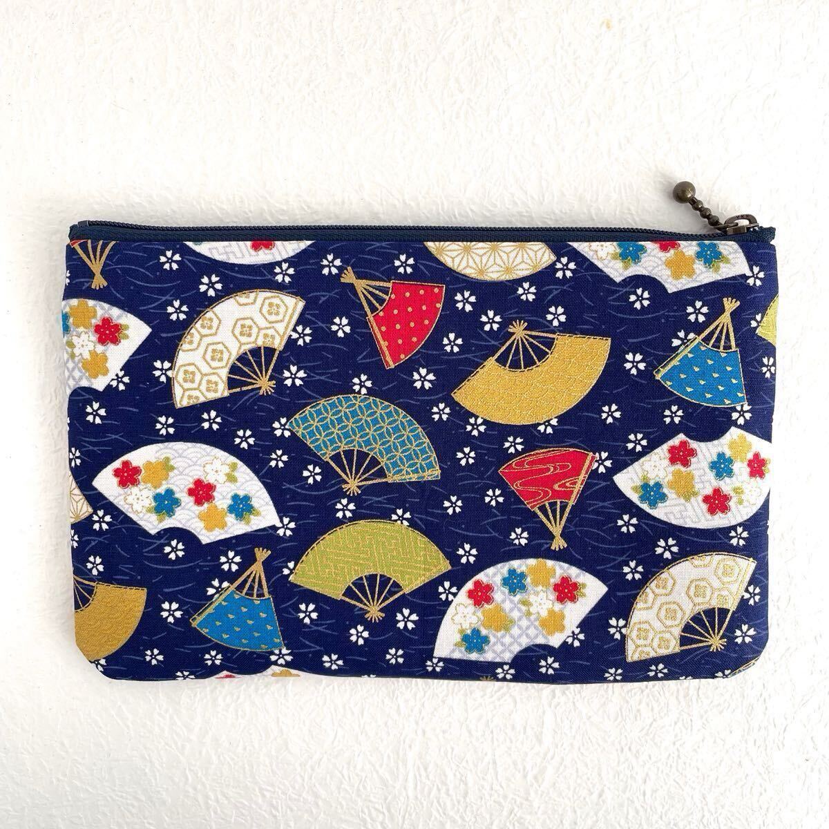 扇子 フラットポーチ 20×13cm ハンドメイド 和柄 通帳入れ お薬手帳入れ ポーチ ペンケース 化粧ポーチ 紺 ネイビー
