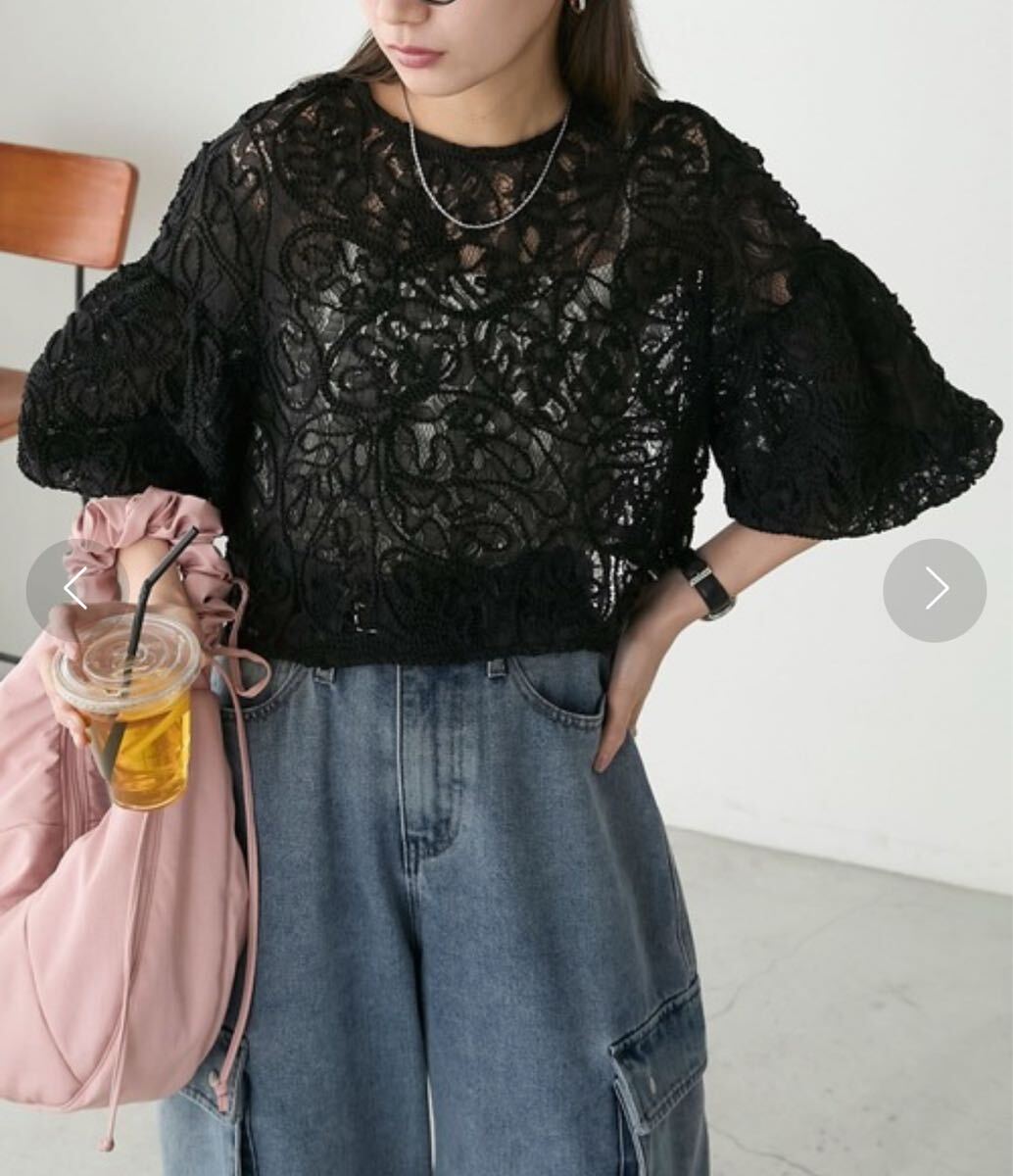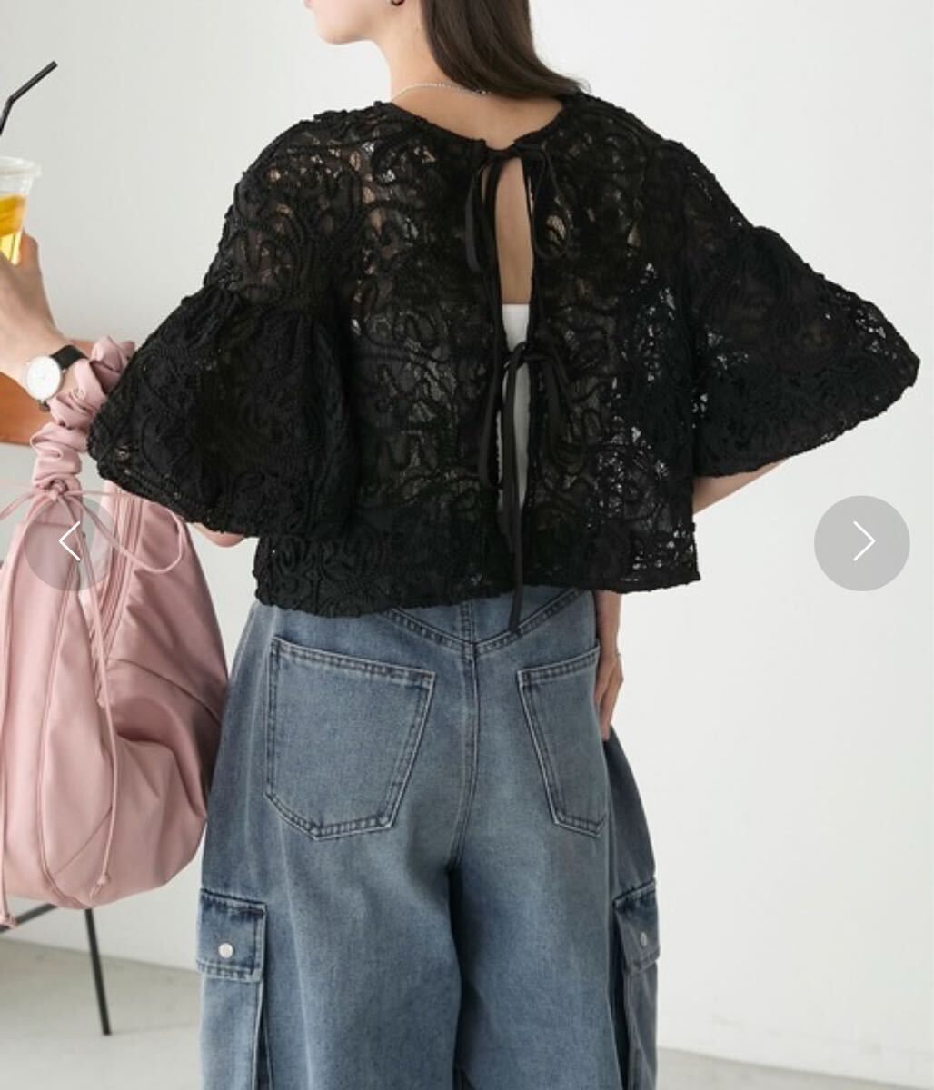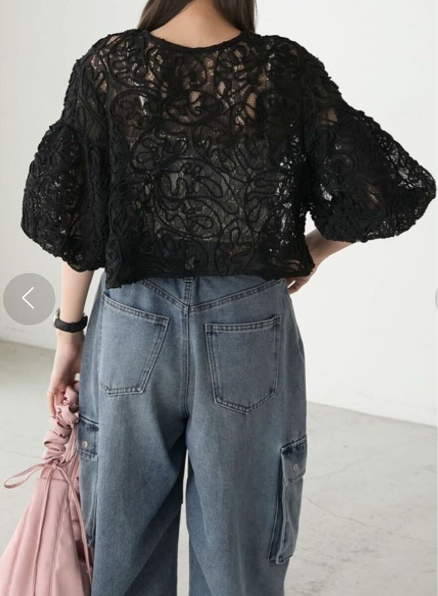 透け素材に立体的な刺繍がリッチな1枚リゾート感漂うフラワーモチーフのシアーブラウス・前後2way着用可能な花柄刺繍ブラウス・カーディガンのように羽織るだけでお洒落度UP・ほわっと広がるパフスリーブがコーデのアクセント・様々なボトムスに合わせやすいクロップド丈・フラワーモチーフの刺繍編みが華やか・バレエコアスタイルにもぴったりなダブルリボン付き・表面感のあるコード刺繍が奥行きのある1枚に