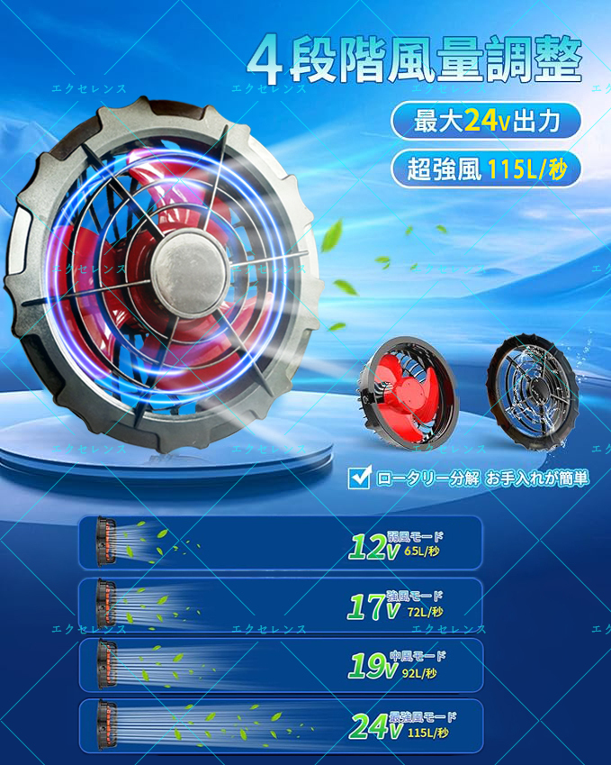 ★【24V超高出力&作業服専用 ファンバッテリーセット】夏最新、空調作業服ファンは航空力学を応用した流線型3枚大面積羽根が搭載して、風の抵抗を35%低減し、風が中心に集まり直進性が高く、パワフルな風を生み出します。30000mAh大容量専用バッテリーが搭載され、ワンボタンで12V-17V-19V-24Vに4段階切り替えるだけでなく、同類製品に比べると24V最強風量モードでもパワーが一定で、風量が弱くならないでずっと115リットル/秒で服内に暴風を送ります。真夏のべたつく汗、焼けつくような日差し対策として活躍します。